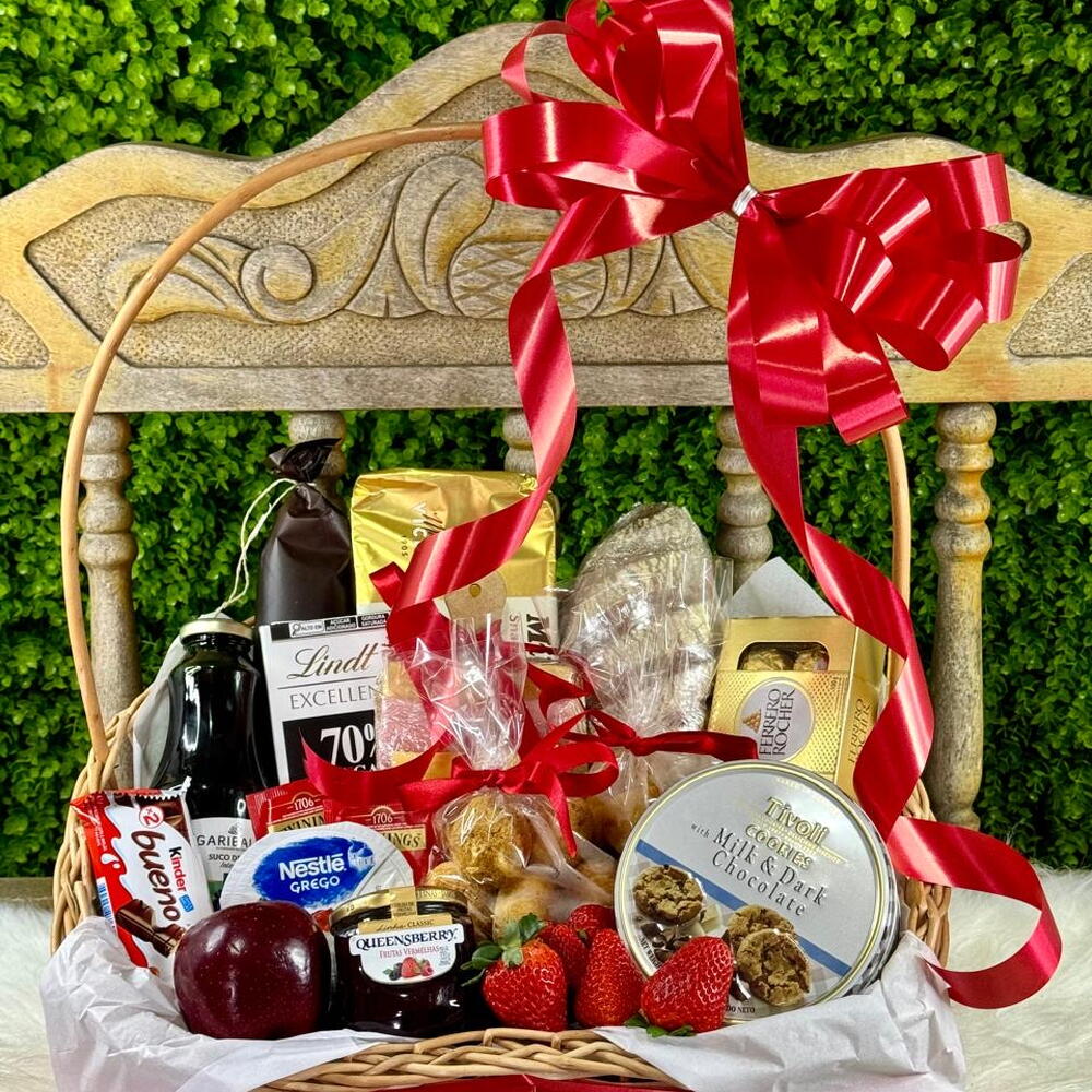 embrulho - 1 un. ferreiro rocher - 1 un. kinder bueno - 1 un. chá twinings - 2 un. pães de queijo - 1 un. queijo e presunto - 1 un. salame italiano - 1 un. geleia queensberry - 1 un. salgado assado - 1 un. maçã importada - 1 un. morangos selecionados - 1 un. pão australiano com notas de cacau - 1 un. suco de uva garibaldi integral - 1 un. chocolate importado linda 70% cacau - 1 un. biscoito matilde vicenzi italiano folhado - 1 un. tivoli muesli and cramberry cookies importado - 1 un. linda cesta decorada com laço - 1 un.