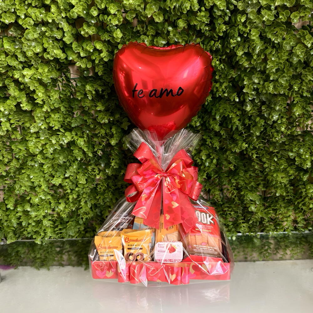 embalagem de designer - 1 un. laço - 1 un. achocolatado - 1 un. café - 1 un. sachê de geleia - 1 un. bandeja decorada - 1 un. balão personalizado com a frase te amo - 1 un. biscoitos deliciosos - 4 un. tubinho de wafer crocante - 1 un. torradas fresquinhas - 2 un.