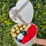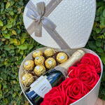 Celebre ocasiões especiais com este luxuoso conjunto de presente. Composto por deliciosos chocolates Ferrero Rocher em uma elegante caixa branca em formato de coração, acompanhados de um fino espumante Chandon Réserve Brut. Para completar, o kit inclui belas rosas artificiais e palha decorativa, conferindo um toque de sofisticação. Ideal para tornar qualquer momento inesquecível.
