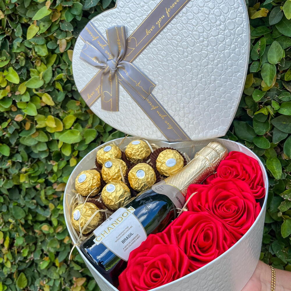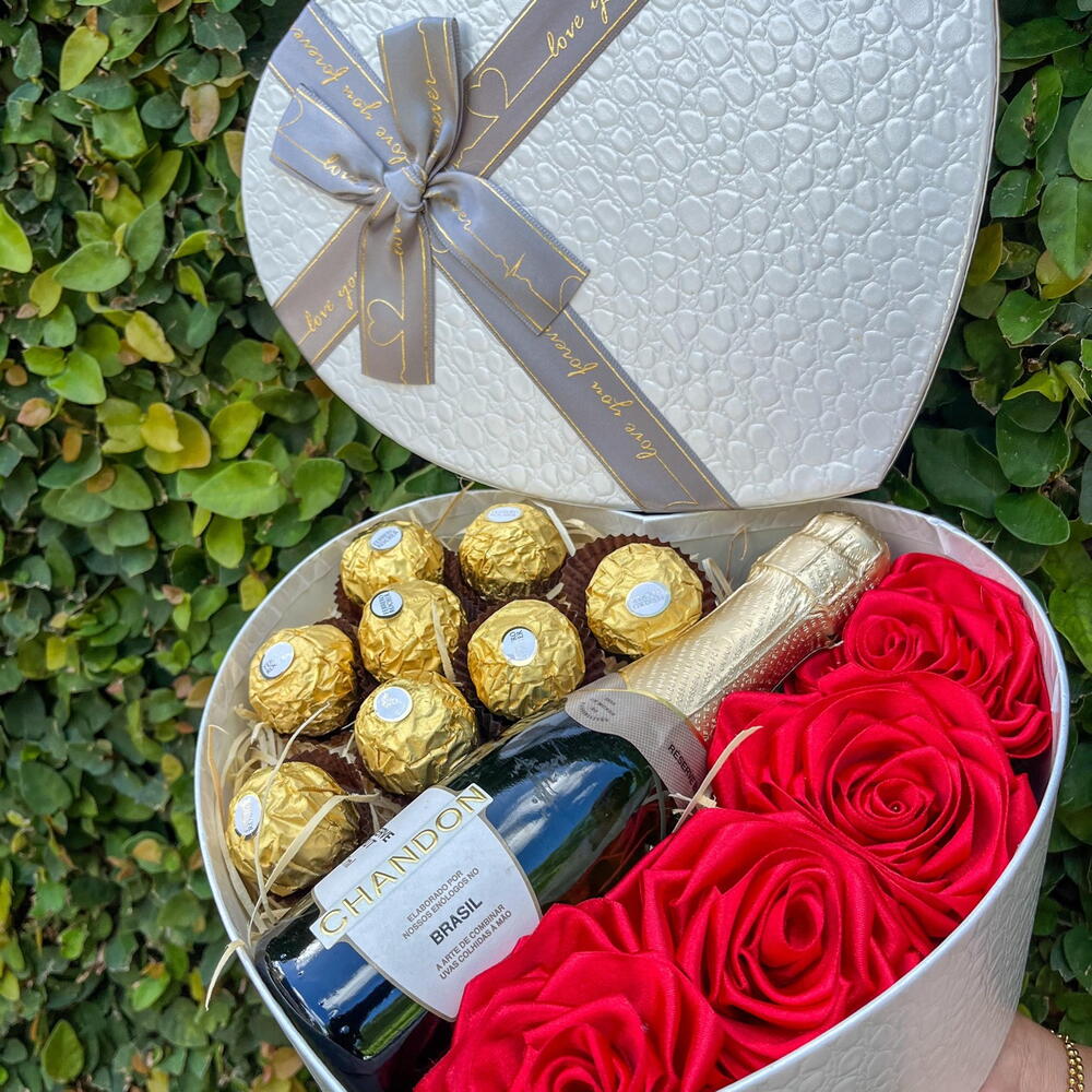 rosa artificial - 4 un. ferrero com 08 un - 1 un. espumante chandon réserve brut 187ml - 1 un. palha decorativa - 1 un. caixa cartonada coração branco - 1 un.