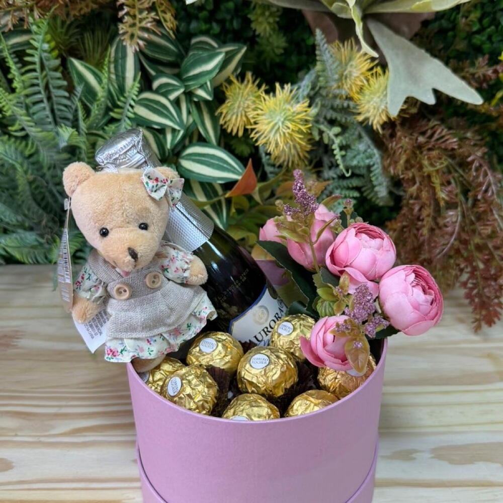box - 1 un. pelúcia - 1 un. ferrero rocher - 8 un. espumante aurora - 1 un.