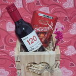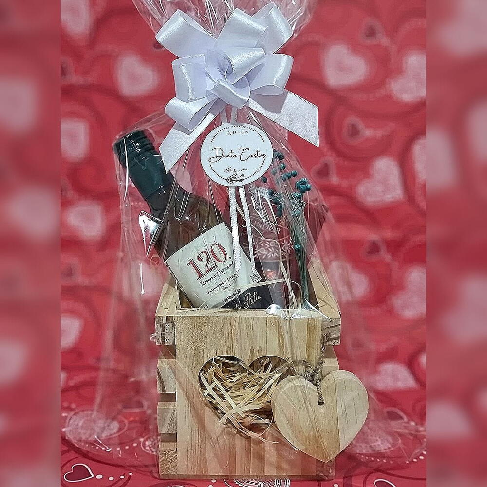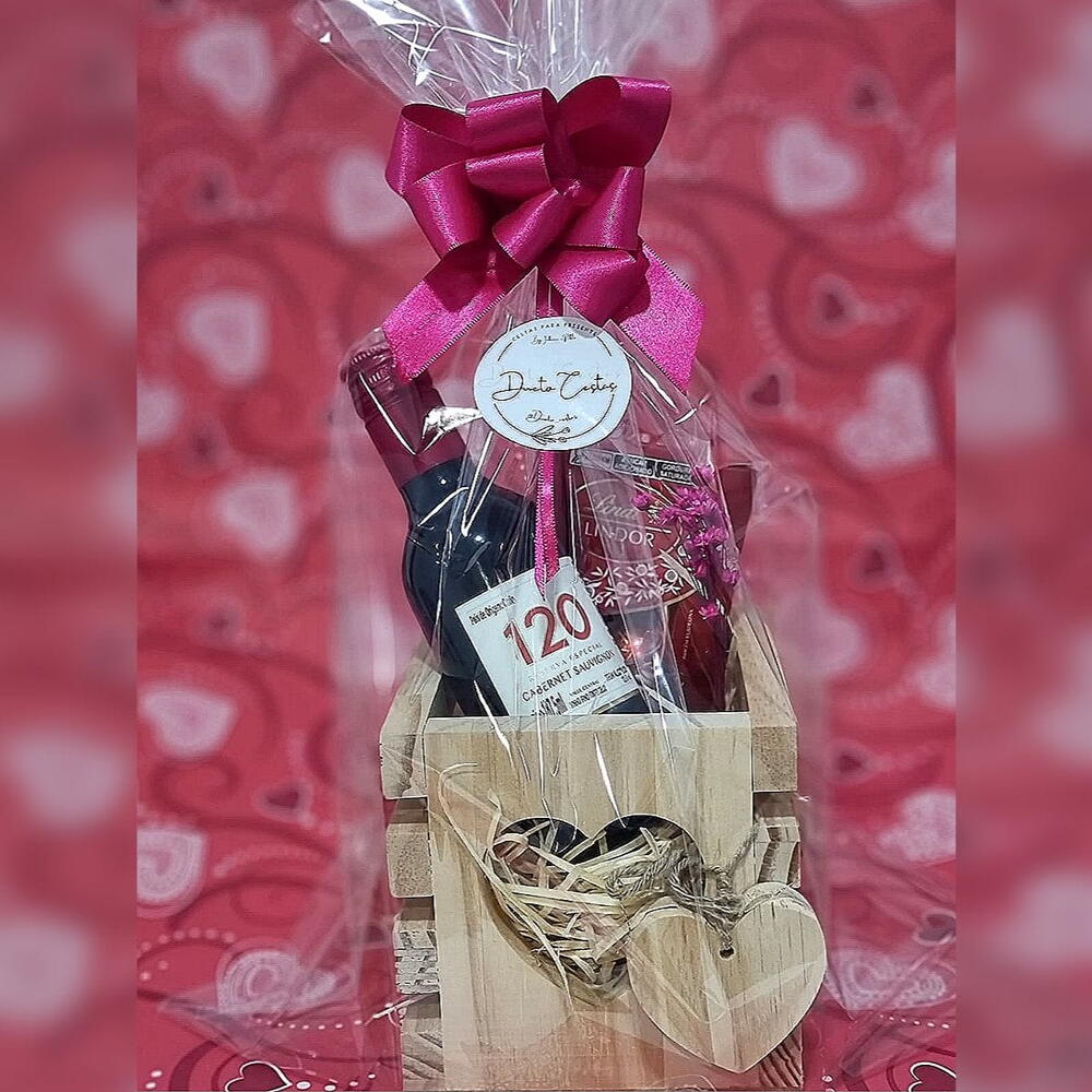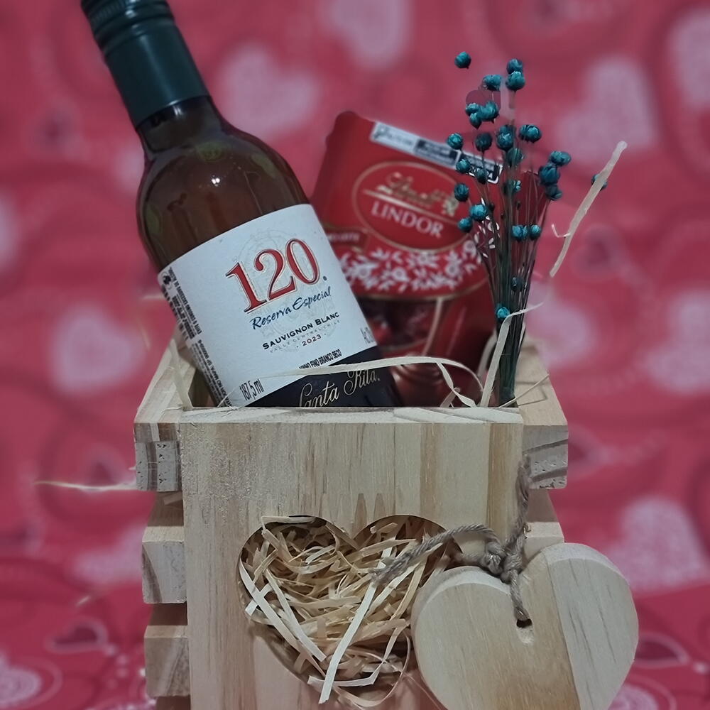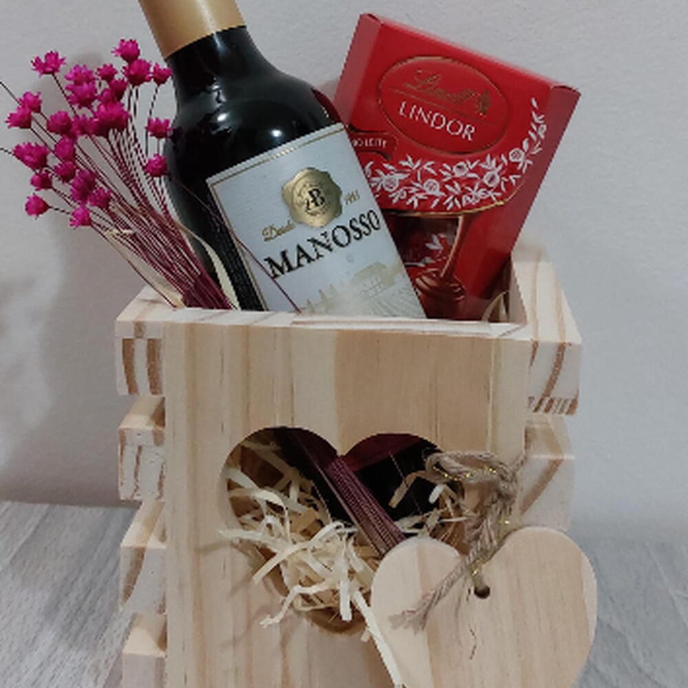 bombom lindt 37g - 1 un. palha decorativa - 1 un. laço decorativo com tag personalizada - 1 un. flor decorativa - 1 un. celofane decorativo - 1 un. caixa pinus de coração talhada - 1 un. vinho tinto chileno 120 cabernet sauvignon 187ml - 1 un.