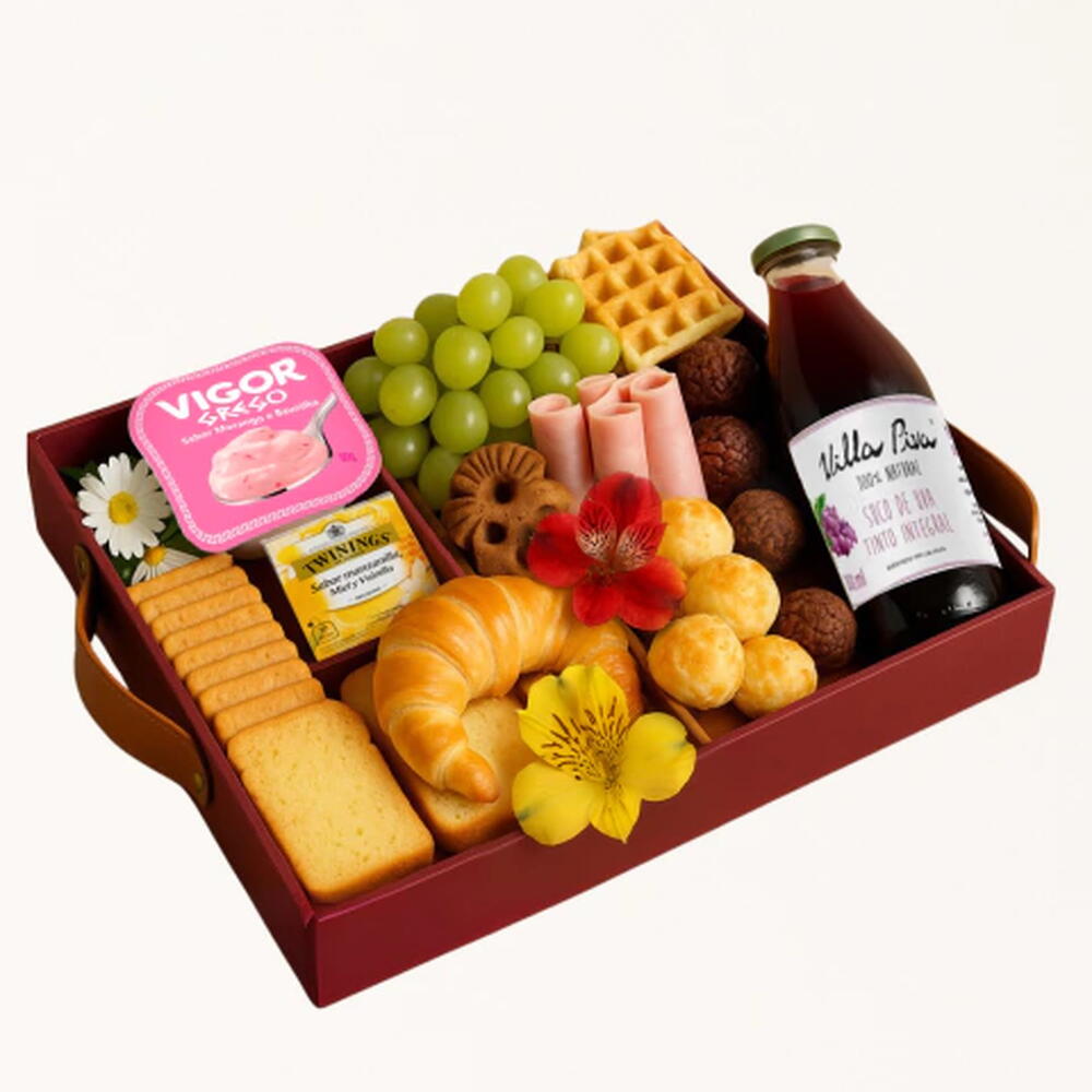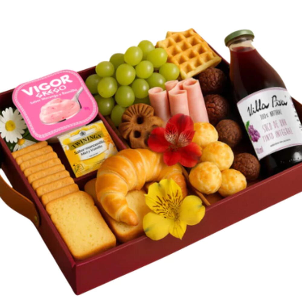 frios - 1 un. brigadeiros - 4 un. chá twinings - 1 un. pães de queijo - 4 un. uvas - 1 un. waffle - 1 un. torradas bauducco - 3 un. café orfeu - 1 un. iorgute grego - 1 un. torrada lev - 6 un. croassaint - 2 un. biscoitinhos sortidos - 6 un. flores astroméria decorativas - 1 un. cesta 1 bandeja mdf - 1 un. mini sachê de manteiga - 1 un. suco vila piva - 1 un.