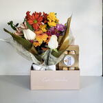 laço - 1 un. arranjo de flores mistas - 1 un. caixa com carinho - 1 un. embalagem moderna - 1 un. caixa com 8 ferrero rocher - 1 un.