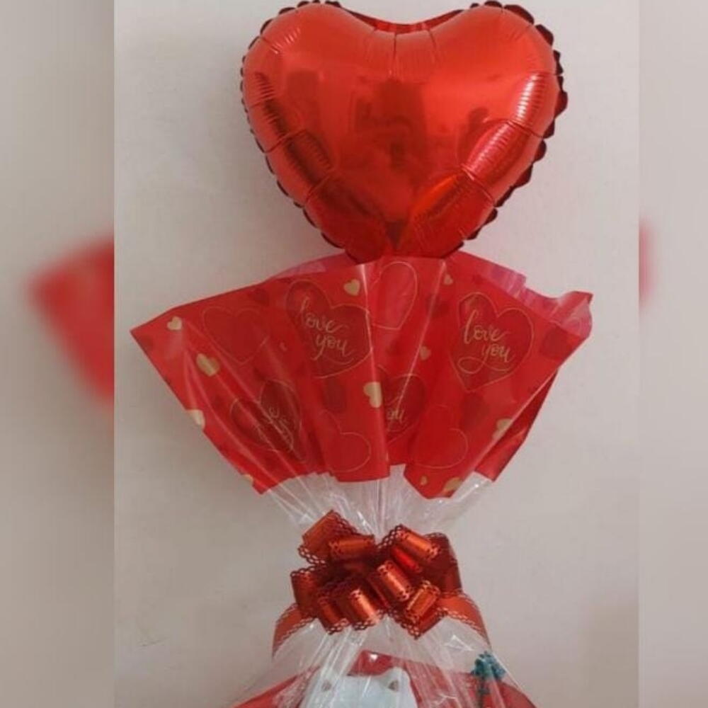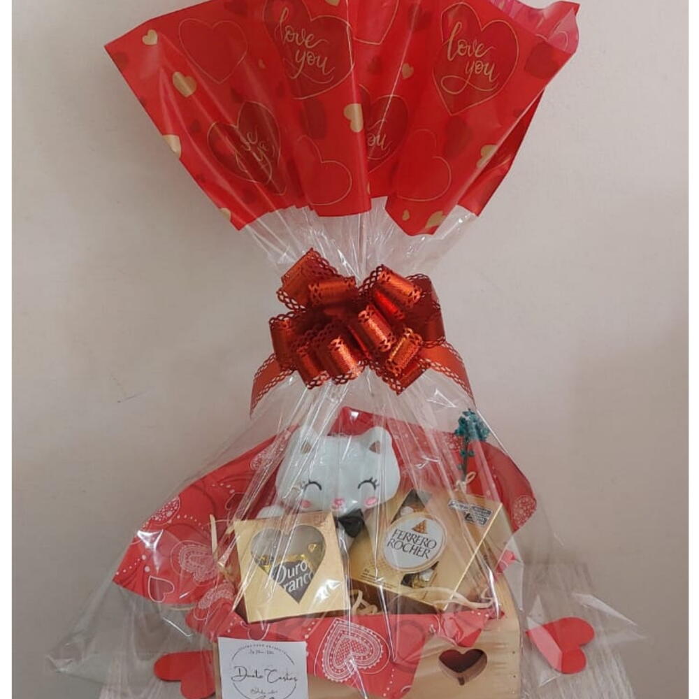 palha decorativa - 1 un. ferrero rocher 50g 4un - 1 un. celofane decorativo - 1 un. belo laço decorativo - 1 un. caixinha romântica com bombom - 1 un. pelúcia chaveiro (podendo ser à escolha) - 1 un. acompanha balão - 1 un.