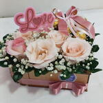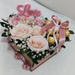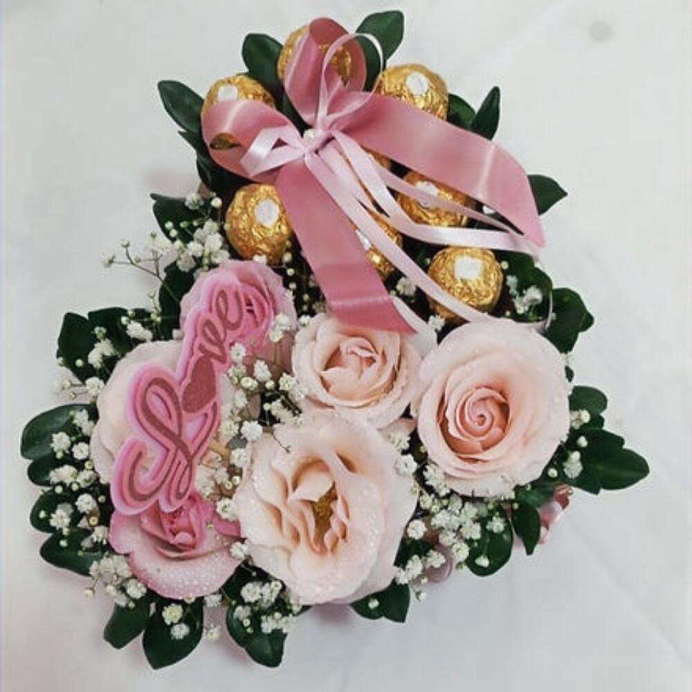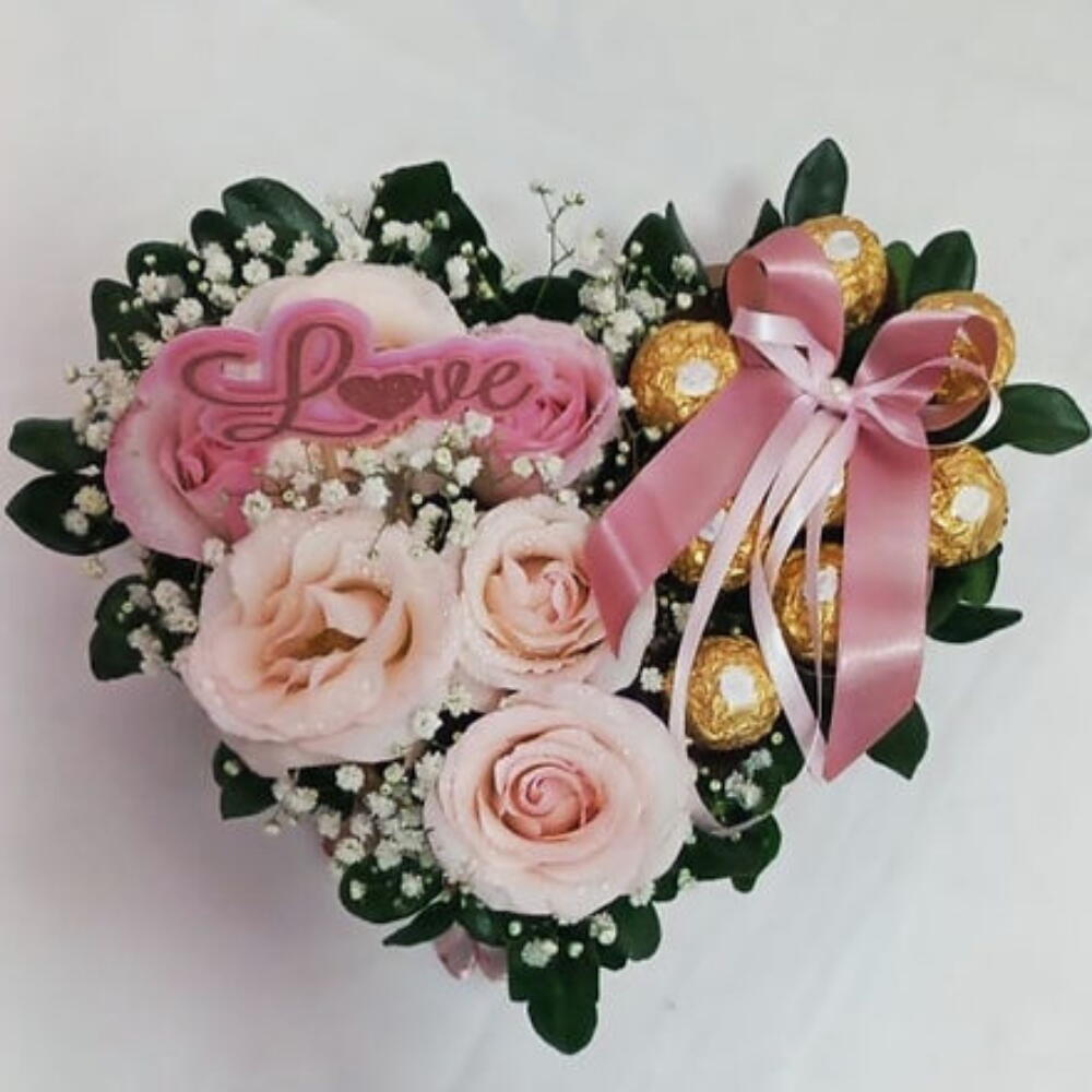 caixa coração - 1 un. arranjo de flores naturais - 1 un. bombons ferreiro rocher - 8 un.