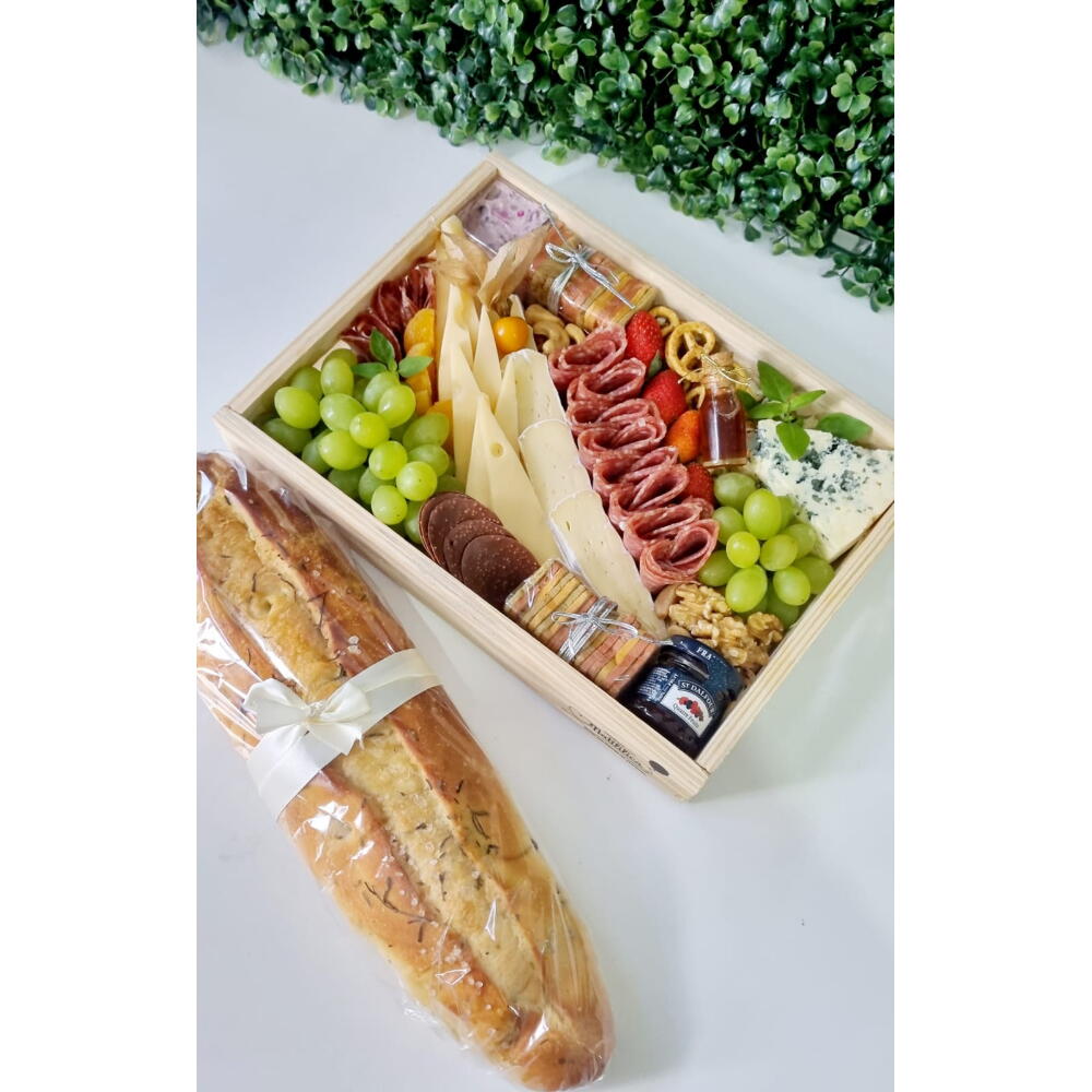 Descubra o mundo gourmet com nossa Tábua de Frios. Esta luxuosa caixa de pinho contém queijos Brie, Gouda e Gorgonzola premium, perfeitamente complementados por pate de azeitona preta, torrada e salame. Experimente também nossa geléia de morango especialmente selecionada, lombo nobre e mel doce. No lado mais doce, oferecemos uvas frescas, morangos suculentos e damascos secos, além de Nuts crocantes. Para completar, incluímos uma baguete de alecrim de fermentação natural. Tudo selecionado para proporcionar uma experiência gustativa única.