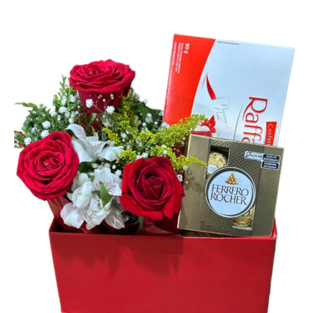 caixa - 1 un. folhagens - 1 un. ferrero rocher - 1 un. rosa vermelhas - 3 un. rafaello - 1 un.