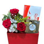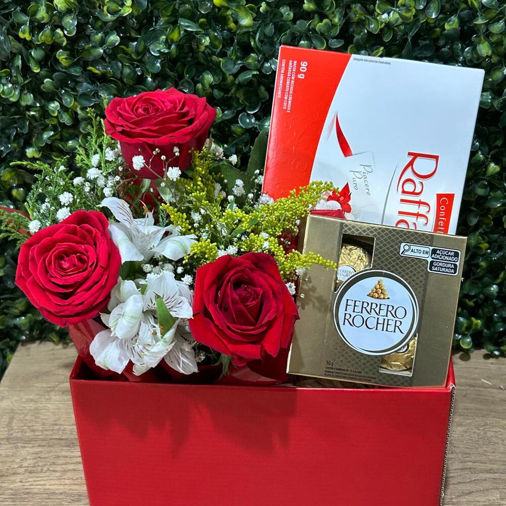Um presente que combina intensidade e delicadeza em cada detalhe. Rosas vermelhas exuberantes harmonizadas com flores brancas e folhagens frescas. Acompanha chocolate especial Rafaello e Ferrero Rocher 4 unidades para tornar o momento ainda mais doce. Uma caixa sofisticada para surpreender com elegância e paixão.