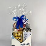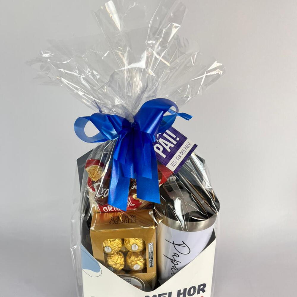caixa de bombons ferrero rocher com 8 unidades - 1 un. caixa envelope tematica dia dos pais - 1 un. copo termico personalizado com escrita - 1 un. pacote de salgadinhos crocantissimo - 1 un. saco celofane e laço para embalagem - 1 un.