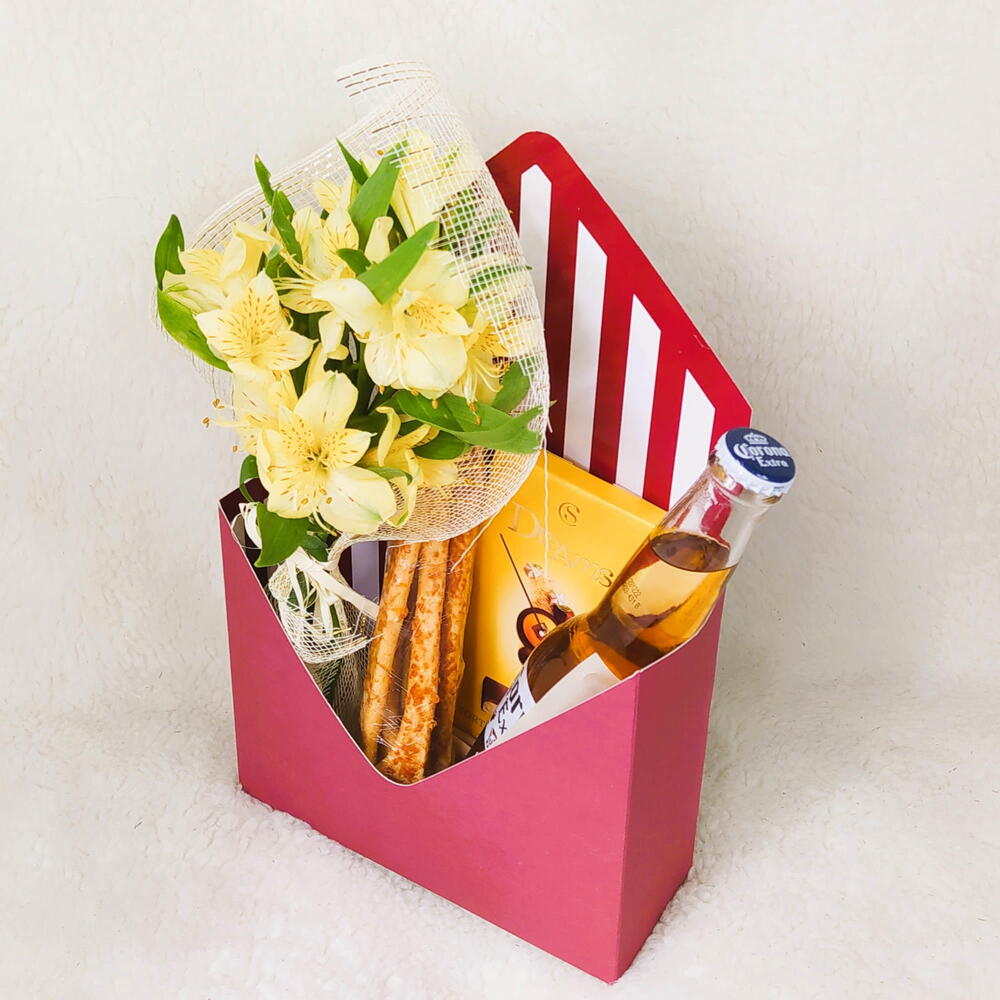 Encante alguém especial com este maravilhoso presente que contém um charmoso Mini Buque de Flores, perfeito para expressar seus sentimentos mais afetuosos. Além disso, ele vem com uma deliciosa porção de Palitos Grissini, que adiciona um toque crocante para qualquer ocasião. Acompanha uma long neck de cerveja, para tornar o momento mais casual e descontraído. E para adicionar uma dose extra de doçura ao presente, incluímos uma deliciosa Barra Cacau Show. Todo o conjunto é apresentado numa elegante Caixa Envelope de diversas cores, embalada em saco celofane com um belo laço de cetim. Este é certamente um presente que está à altura de qualquer ocasião dedicada a alguém muito especial.