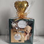 Surpreenda alguém especial com esta linda cesta de chocolates. Nela, você encontrará uma fofa pelúcia-chaveiro, um delicioso Raffaello de três unidades e uma caixa premium de Ferrero Rocher com quatro unidades. Além disso, a cesta inclui um elegante laço de decoração e um mini balão para tornar seu presente ainda mais festivo. Tudo isso apresentado em uma encantadora caixa de presente verde. Um mimo perfeito para ocasiões especiais!