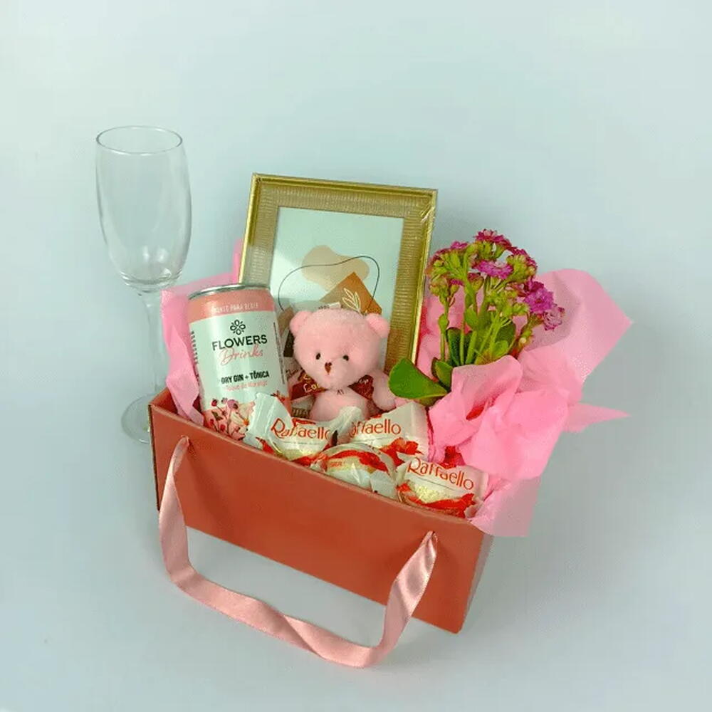 taça - 1 un. bombons rafaello - 4 un. chaveiro de ursinho - 1 un. flowers drink gin - 1 un. vaso de flor natural kalanchoe pt 06 - 1 un. porta retrato luxo 10x15 - 1 un. caixa kit rose - 1 un.