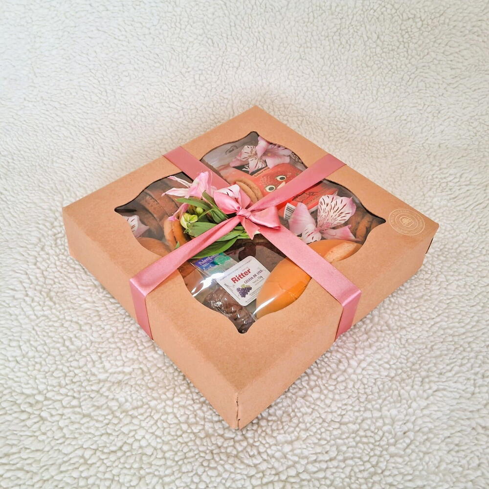 cookies - 1 un. brownie - 1 un. pães - 2 un. mini rocambole - 2 un. porção de torrada - 50 gr. bolacha amanteigada - 1 un. suco ou café - 1 un. mini geleia ou mini manteiga - 1 un. polnguinho - 1 un. cesta kraft com visor e fita de cetim (essa cesta vai embalada em plástico celofane e um lindo laço de cetim) - 1 un.