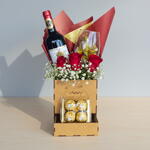 Este presente com vinho é incrivelmente elegante, perfeito para celebrar ocasiões especiais. Composto por três rosas delicadas, complementadas por detalhes em mosquitinhos, este presente torna-se ainda mais sofisticado com a inclusão de um vinho chileno reservado, reputado por sua qualidade. Para coroar esta seleção deliciosa, incluímos também uma taça de vinho de cristal com capacidade de 650ml, permitindo que o destinatário deguste o vinho em grande estilo. Entretanto, este presente não estaria completo sem um toque doce. Assim, incluímos uma unidade de Ferrero Rocher e quatro bombons sortidos, da Ouro Branco e Sonho de Valsa, garantindo uma explosão de sabores. Todos estes itens são cuidadosamente acondicionados numa caixa de madeira requintada de 15x15 e finalizados com uma embalagem moderna. Este é o presente perfeito para impressionar a pessoa amada!
