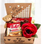 kitkat - 1 un. hanuta - 1 un. mini ursinho em formato de chaveirinho - 1 un. uma rosa artificial - 1 un. caixinha em mdf com frase eu te amo vazado - 1 un. uma barra pequena de chocolate suflair - 1 un.