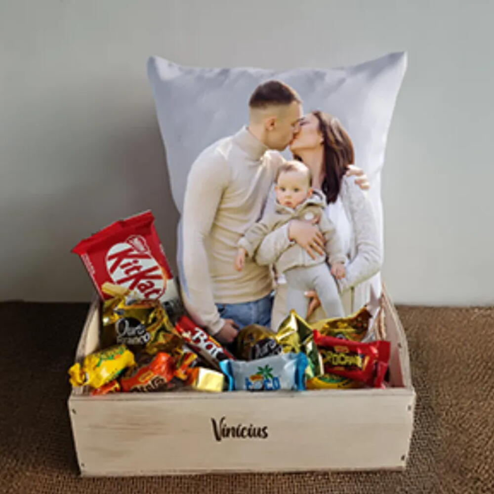 laço - 1 un. chocolate kitkat - 1 un. embalagem celofane - 1 un. chocolates sortidos - 10 un. cartinha dedicatória - 1 un. caixote em madeira 15x25x10cm com nome gravado a laser - 1 un. almofada personalizada 30x20cm com nome - 1 un. foto ou frase - 1 un.