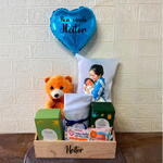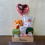 sabonete lenço umedecido toalha balão almofada pelucia shampoo - 1 un. shampoo natura mamãe e bebê (200ml) - 1 un. caixa com 5 sabonetes natura mamãe e bebê (90g cada) - 1 un. embalagem de lenços umedecidos natura mamãe e bebê - 1 un. toalha com capuz para envolver o bebê - 1 un. almofada personalizada (20x30cm) com nome - 1 un. pelúcia fofa (20cm) - 1 un. balão metalizado personalizado (rosa ou azul) - 1 un. caixote em mdf (20x30cm) - 1 un.