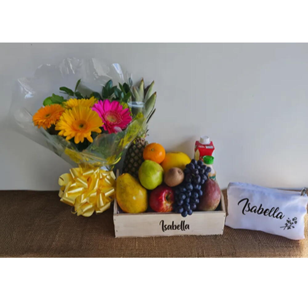 suco 200ml - 1 un. frutas da época - 8 un. embalagem celofane - 1 un. água de côco - 1 un. laço rústico - 1 un. (a depender da disponibilidade da época) - 1 un. nécessaire personalizada com nome do presenteado - 1 un. caixote tamanho 20x30x10cm - personalizado com nome gravado a laser - 1 un. buquê com 4 gérbera - 1 un.