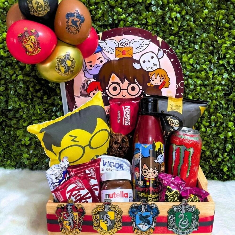 Caixote Harry Potter com mini painel, garrafinha, salgadinho, Monster, chocolates, Nutella, almofada personalizada, cookies iogurte, kitkat, biz extra