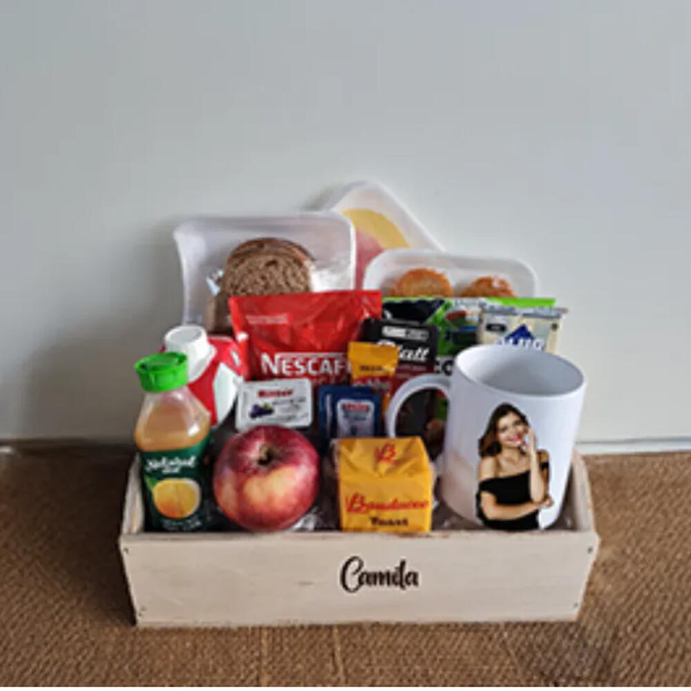 água de coco - 1 un. sachê de café - 1 un. sachê de chá - 1 un. barra de cereal - 1 un. geléia - 1 un. sachês de adoçante - 4 un. suco de frutas - 1 un. frutas da estação - 2 un. fatias de presunto - 2 un. fatia de queijo - 1 un. cartinha dedicatória - 1 un. caixote tamanho 20x30cm -personalizado com nome gravado a laser - 1 un. pãezinhos integrais - 4 un. pct. de torrada integral - 1 un. queijinho processado light - 2 un. pct. de biscoitos integrais - 1 un. pct. de bolachas integrais - 1 un. muffins (mini bolo) de aveia com banana - 2 un. barra de chocolate (sem adição de açúcar) - 1 un. caneca personalizadas com (frase - 1 un. nome ou foto) - 1 un.
