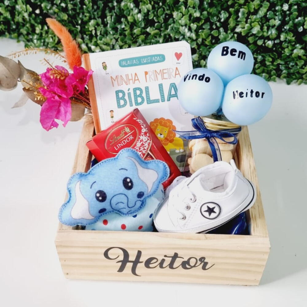 chocolate - 1 un. pelucia - 1 un. cartão - 1 un. cesta mdf - 1 un. mini arranjo flores secas - 1 un. conjunto de mini balão - 1 un. calçado - 1 un. pote com guloseima - 1 un.