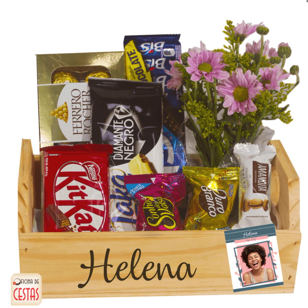 Apresentamos esta luxuosa Cesta de Chocolate, perfeita para transformar qualquer momento em uma celebração deliciosa. Recheada com uma seleção de chocolates de alta qualidade, incluindo uma caixa de Ferrero Rocher com 8 bombons irresistíveis, um tablete de KitKat para desfrutar, uma barra de chocolate saborosa de 90g, 3 chocolates sortidos das reconhecidas marcas Lacta, Nestlê ou Garoto e 20 unidades de chocolates Bis embalados individualmente. Além dessas delícias, a cesta também acomoda um mini arranjo de flores do campo para adicionar um toque de frescor e beleza ao presente. Há também espaço para personalizar a experiência com uma foto e um cartão de dedicatória, onde sua mensagem será cuidadosamente transcrita. Tudo isso é delicadamente organizado em um caixote de madeira, com as dimensões precisas de 15x25x10 cm, que pode ser personalizado com o nome do destinatário gravado a laser, tornando este presente ainda mais especial. A embalagem final inclui um acabamento em celofane transparente complementado por um laço rústico requintado. Esta Cesta de Chocolate é a surpresa perfeita que agrada aos olhos e ao paladar!
