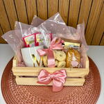 caixa de chocolate - 1 un. caneca personalizada - 1 un. suco em pó - 2 un. caixa madeira pinus - 1 un. biscoito sortido - 1 un. pão variado - 1 un.