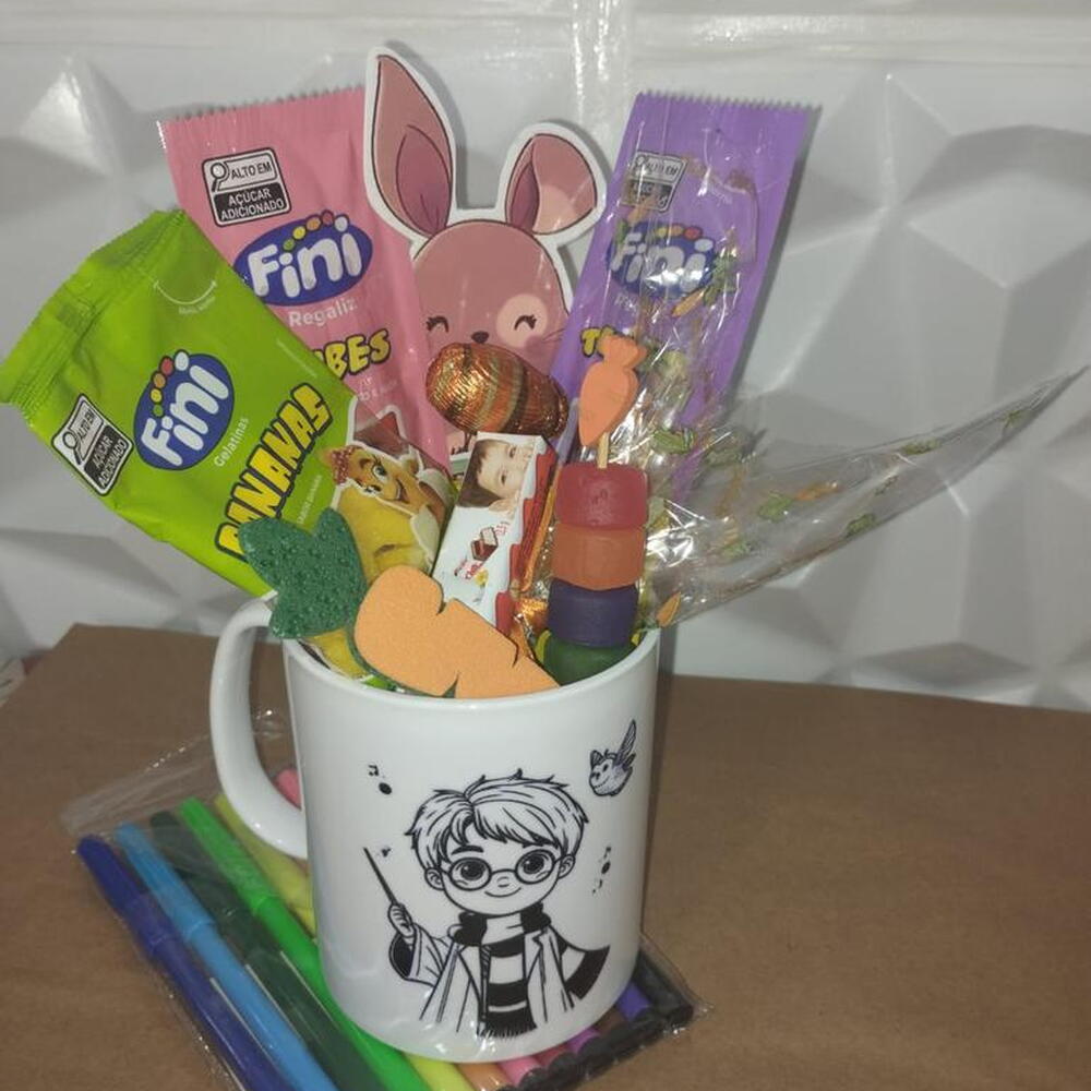 guloseimas - 1 un. caneca píntável - 1 un. canetinhas - 1 un.