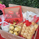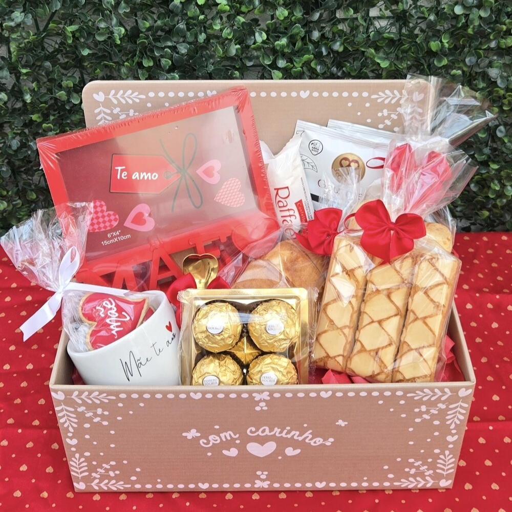 Cesta com display contendo Porta retrato te amo Mãe, 2 sachês de café Gourmet 3 corações, Caneca 170 ml escrito Eu te amo Mãe( ou outra frase mediante disponibilidade) com colher dourada de coração e laço, 2 biscoitos de coração escrito Mãe, Ferrero Rocher de 4 un, Rafaello de 3 un, croissant de presunto e queijo, 5 pães de queijo recheados com catupiry e biscoitos doces mil folhas. Acompanha embalagem, tag de dia das Mães e chaveiro de coração dourado com a frase com amor!