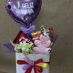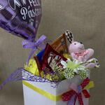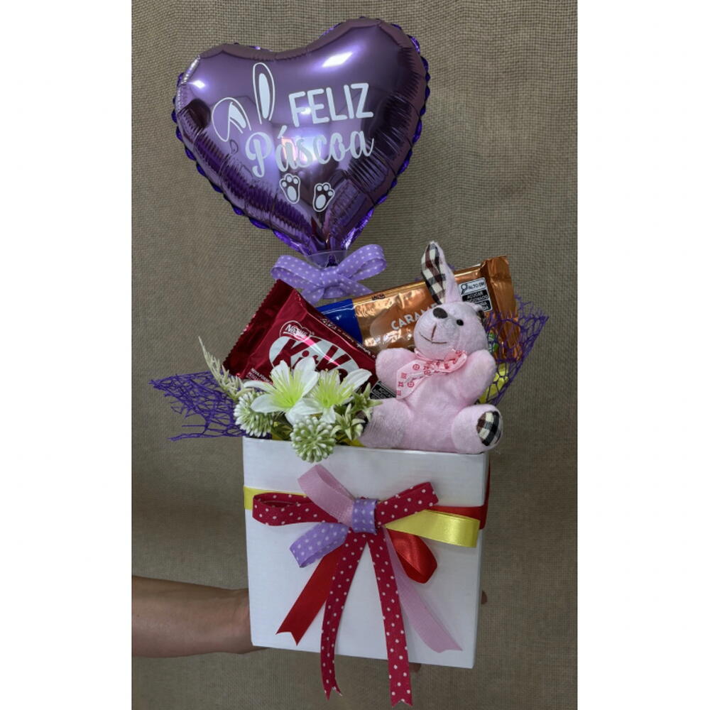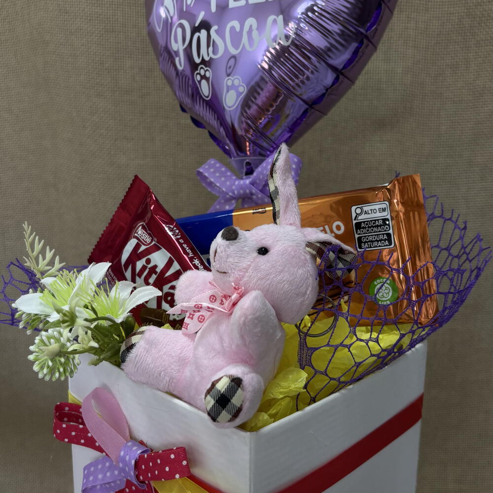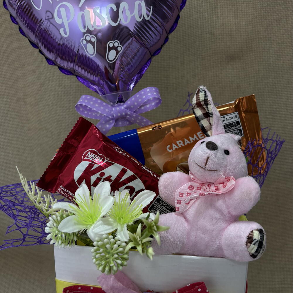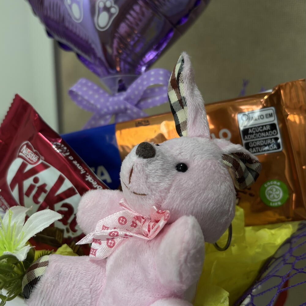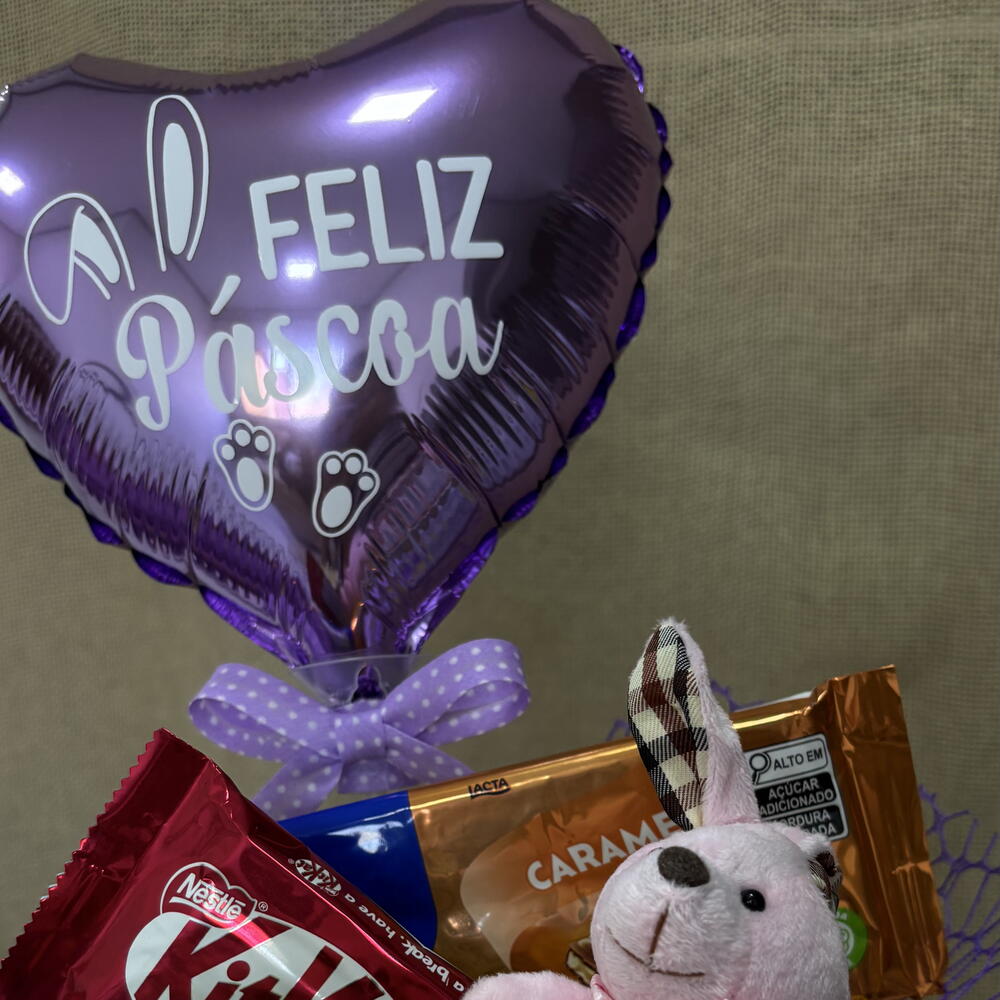 balão metalizado personalizado - 1 un. kitkat - 1 un. cachepot decorado - 1 un. barra de chocolate 75g - 1 un. chaveiro de coelho - 1 un.
