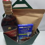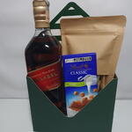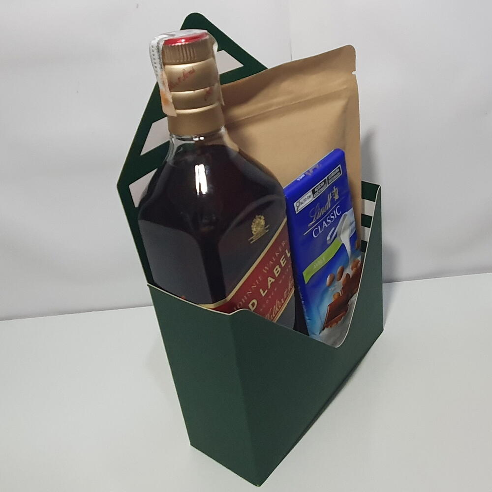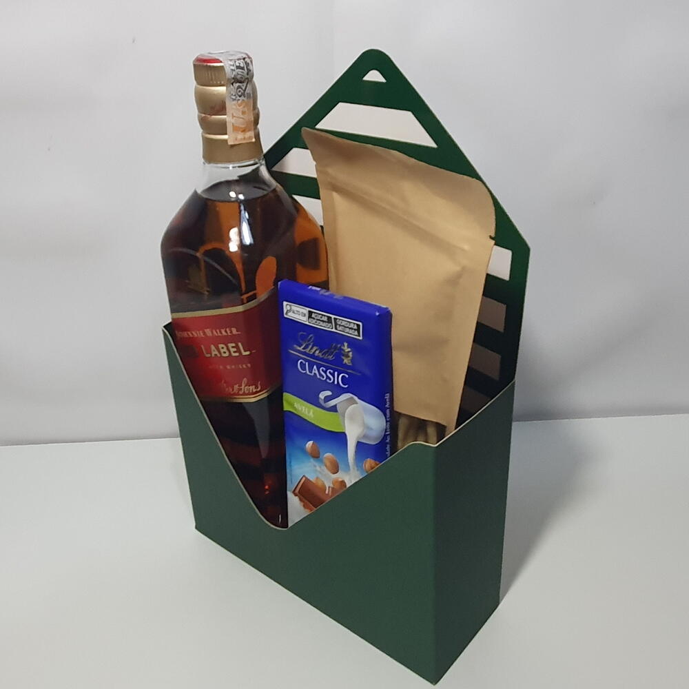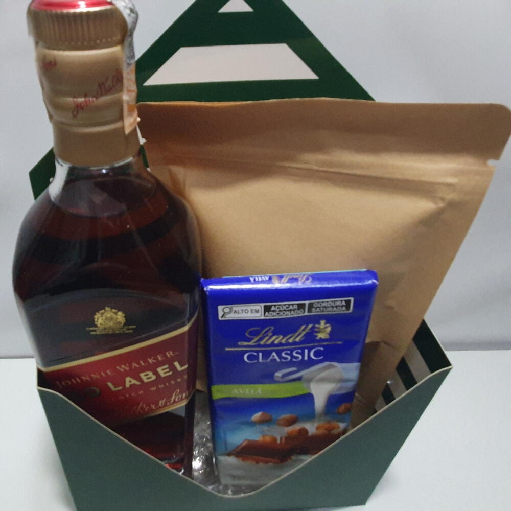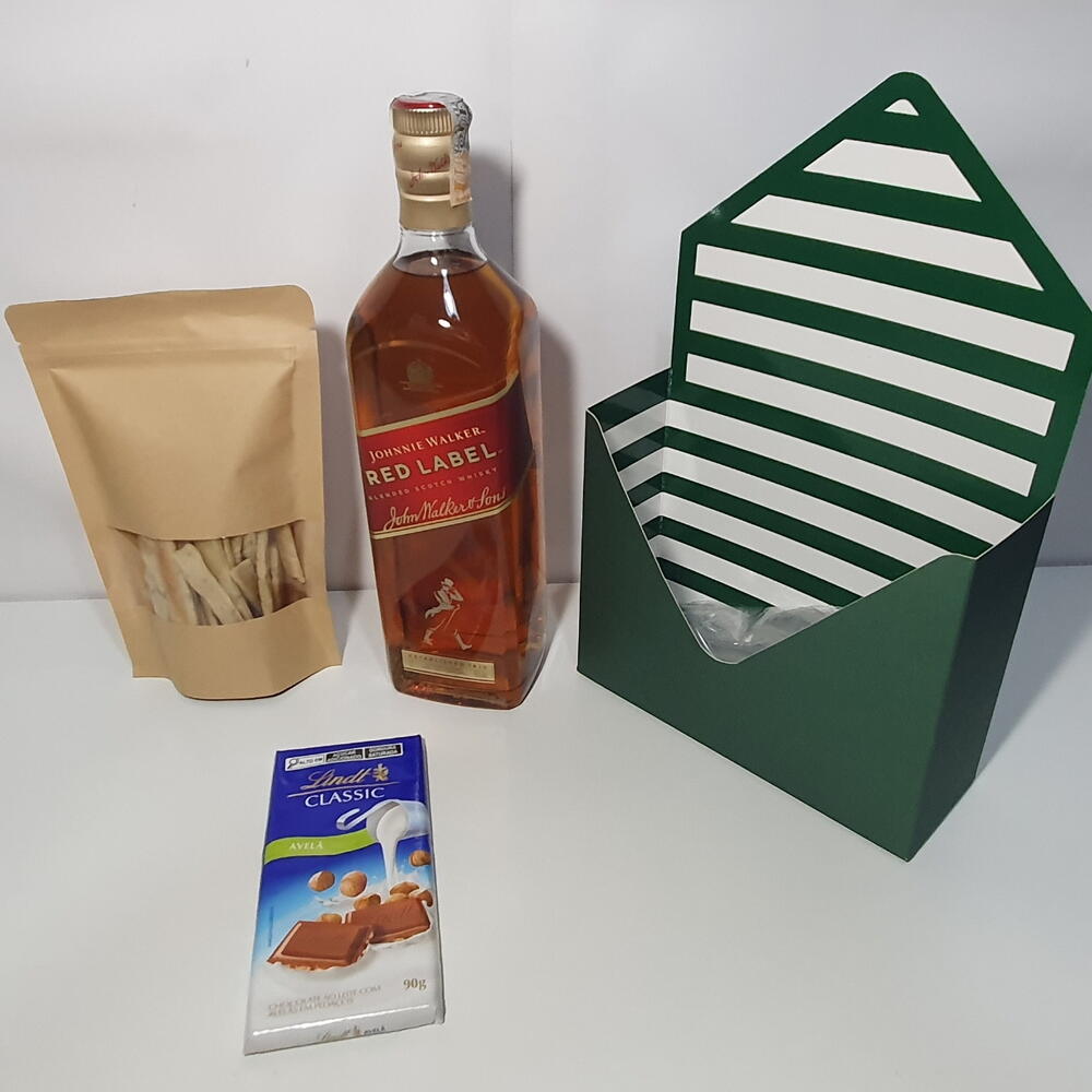 cartão para mensagem - 1 un. laço decorativo - 1 un. craker artesanal salgado - 100 gr. celofane para fechamento - 1 un. papel de seda ou folha de celofane - 1 un. envelope cartonado - 1 un. whisky red label 500ml - 1 un. barra de chocolate lindt 100g ou ferrero rocher com 8 unidades - 1 un.