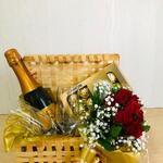 baú decorado - 1 un. cartão de felicitações - 1 un. taças de champanhe - 2 un. arranjo de rosa naturais; - 1 un. espumante rio sol (500 ml) - 1 un. caixa de bombons italianos ferrero rocher (8 unidades) - 1 un.