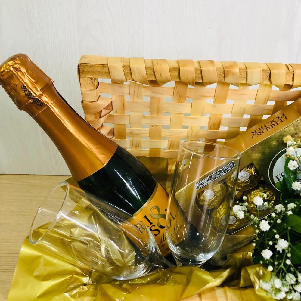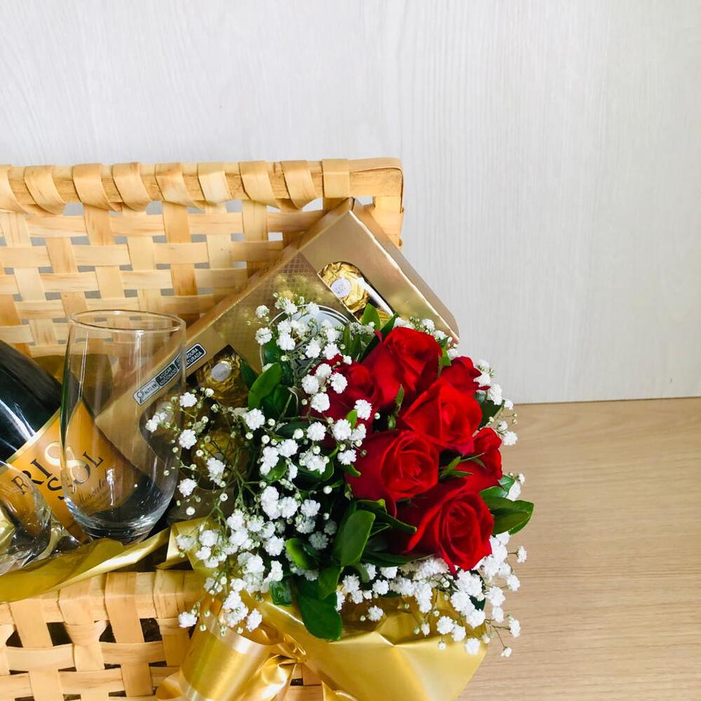 baú decorado - 1 un. cartão de felicitações - 1 un. taças de champanhe - 2 un. arranjo de rosa naturais; - 1 un. espumante rio sol (500 ml) - 1 un. caixa de bombons italianos ferrero rocher (8 unidades) - 1 un.
