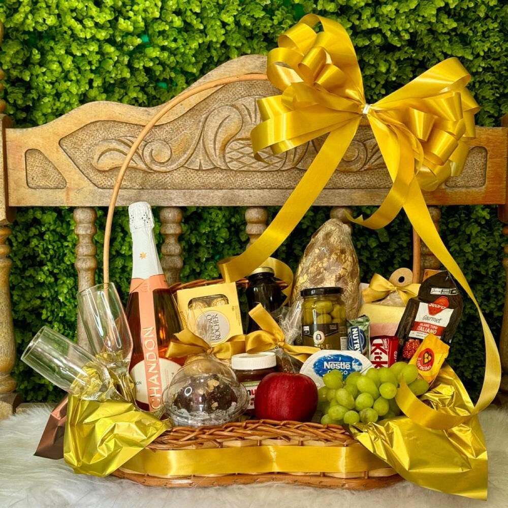 Presenteie alguém especial com nossa luxuosa Cesta de Café da Manhã. Repleta de delícias para tornar qualquer manhã inesquecível, esta cesta combina uma seleção de iguarias refinadas. Inclui uma unidade de Nutella para mergulhar no cobiçado pão australiano, uma barra de Kitkat, uma garrafa de Chandon 750ml acompanhada por duas taças especiais para champagne, uma caixa de Ferrero Rocher, um iogurte Nestlé, uma porção de cappuccino 3 Corações, deliciosos salgados assados, uma maçã importada, uma barrinha Nutry e uma tortelete. A cesta vem em um belo cesto de vime com embalagem decorativa e laço artesanal. E para completar, uvas selecionadas sem sementes, um delicioso suco de uva integral Garibaldi, azeitonas Mamma Bia, fatias de salame tipo italiano e fatias de queijo e presunto servidos em uma tábua de MDF. Um presente verdadeiramente gourmet para começar o dia com satisfação.