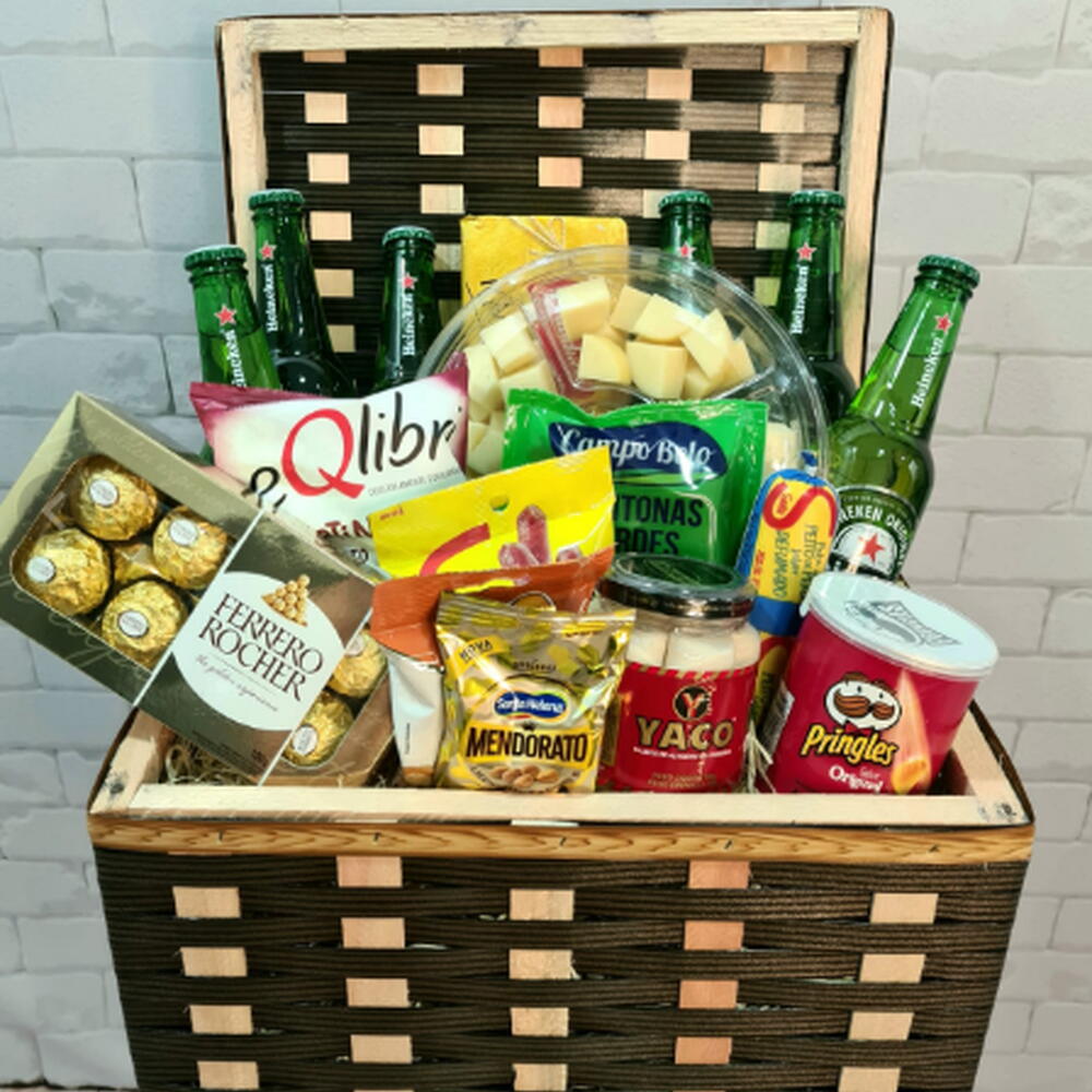batata pringles - 1 un. caixa de ferrero rocher - 1 un. pacote de torrada - 1 un. pote de patê - 1 un. tábua de frios com 03 tipos de queijos - 1 un. vidro de palmito - 1 un. cerv3jas long neck - 6 un.