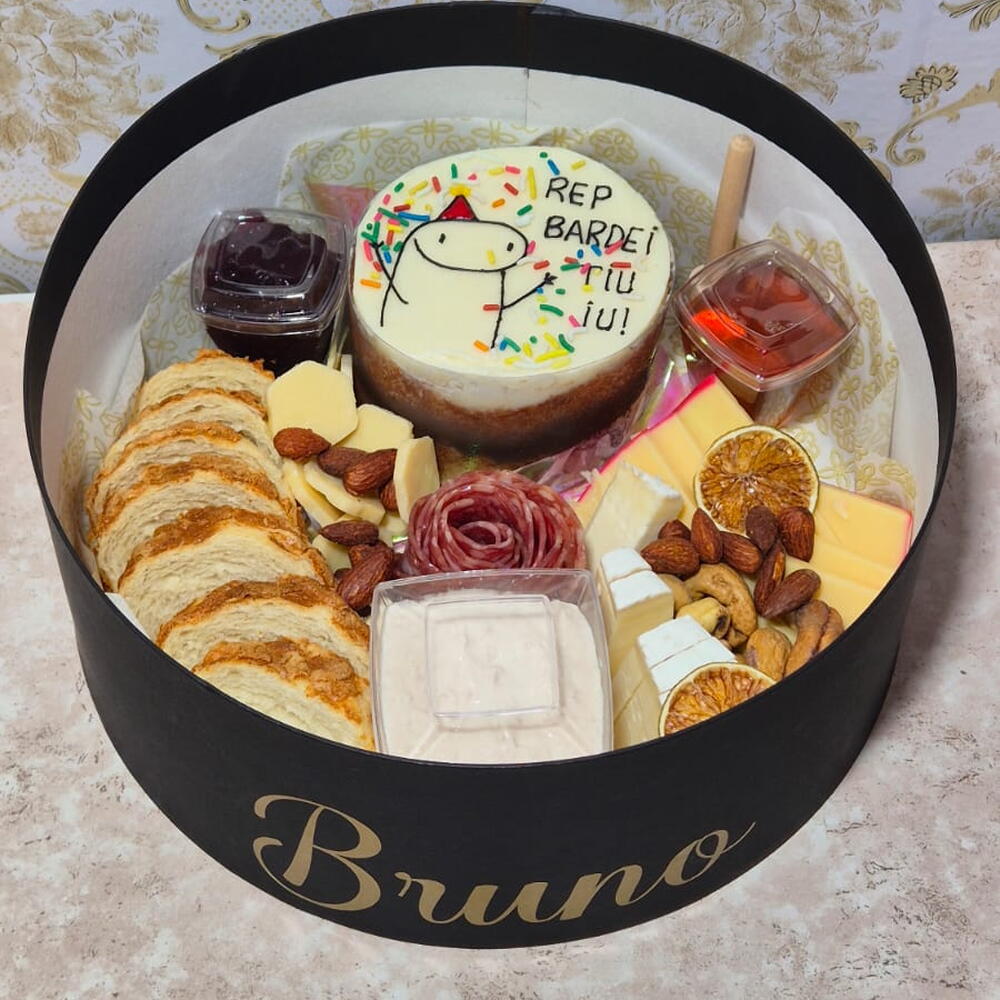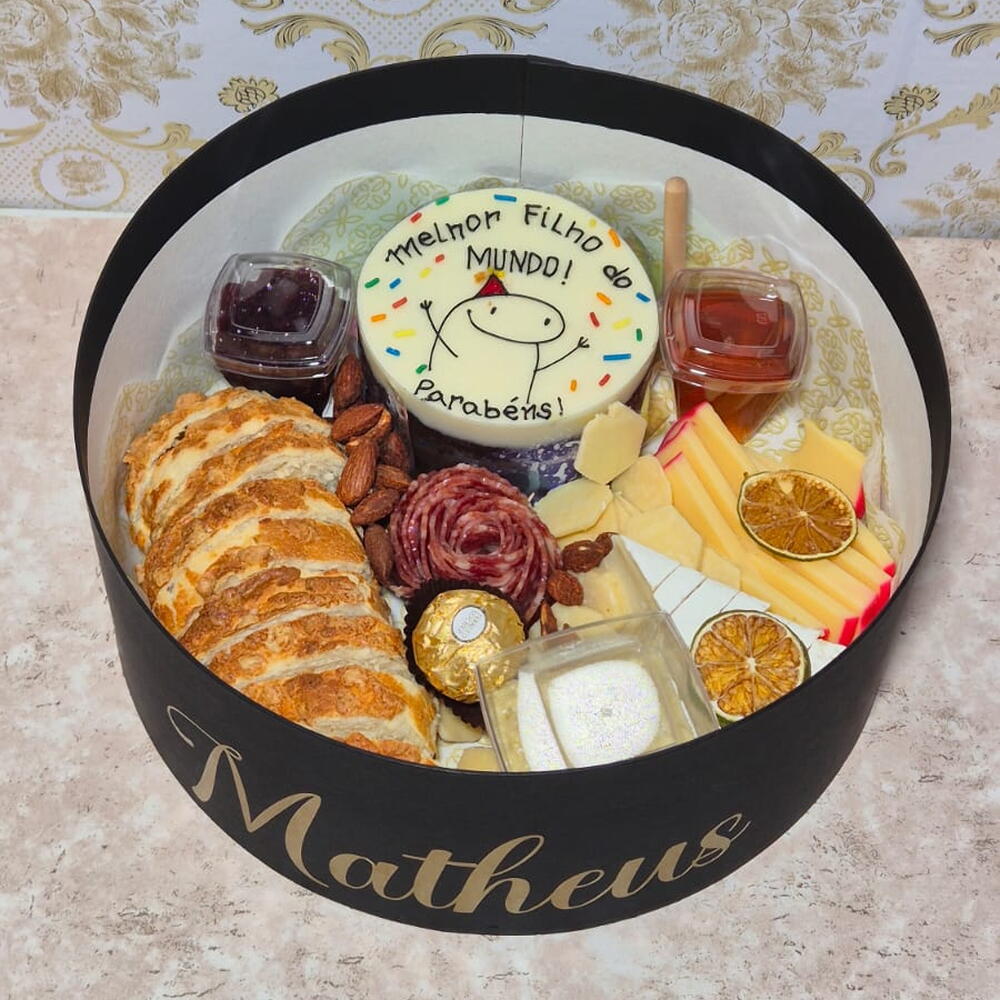 Bolo Bentô 10cm com frase personalizada (sabores da massa e do recheio a escolher), Queijos: brie, gouda e parmesão. Salame, pão ciabata, pastinha salgada, mel, geleia e bombom importado e Cartão De/Pará. Sabores da Massa do Bolo : Chocolate Baunilha Sabores do Recheio do Bolo : Brigadeiro de Chocolate Brigadeiro de Maracujá Brigadeiro de Morango Brigadeiro de Ninho Brigadeiro de Coco