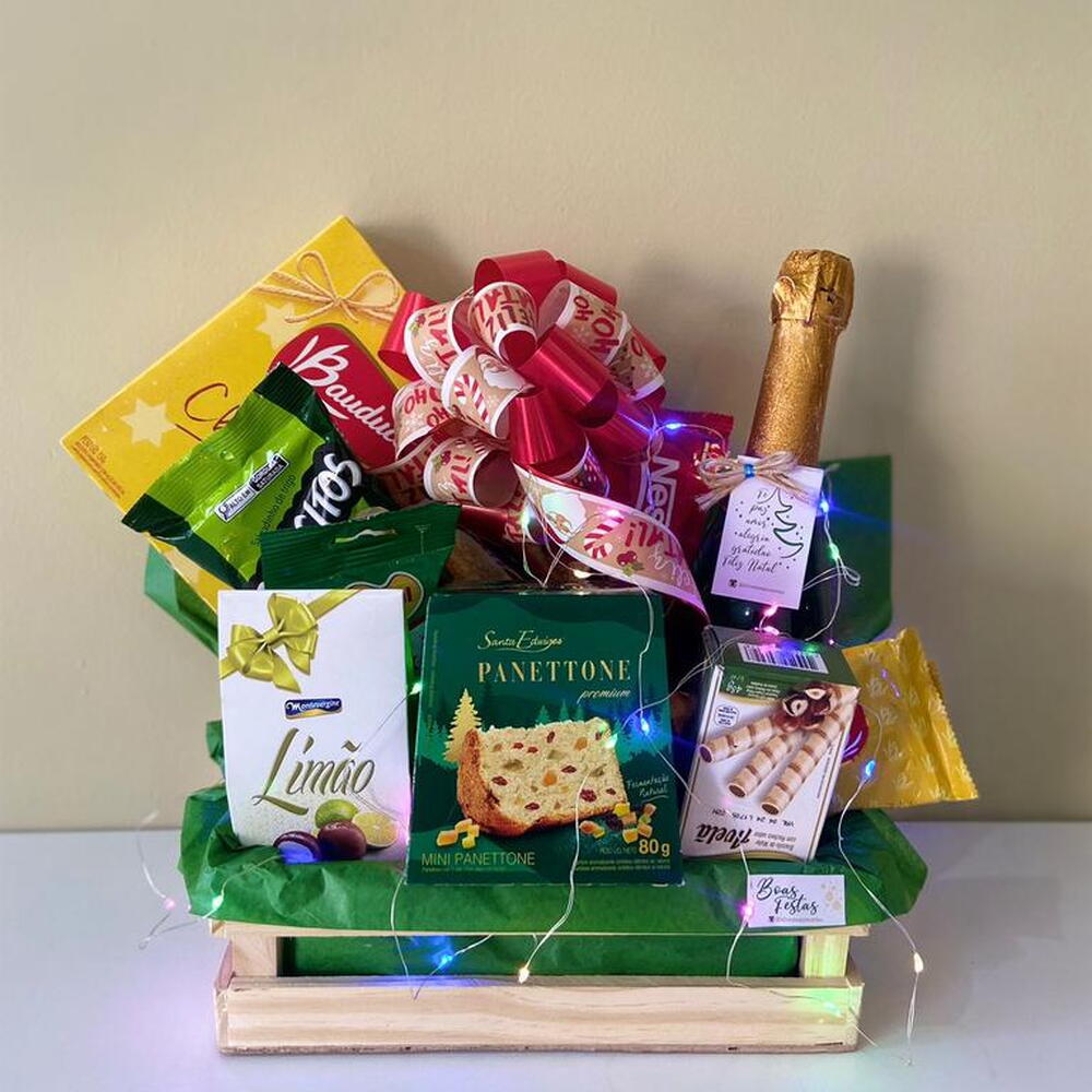 embalagem - 1 un. pão de mel - 1 un. tubete - 1 un. amendoim - 1 un. caixote de madeira - 1 un. trufas de chocolate - 1 un. mini panetone - 1 un. sidra ou suco de uva - 1 un. cookiens - 1 un. biscoito champagne - 1 un.