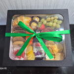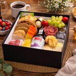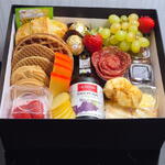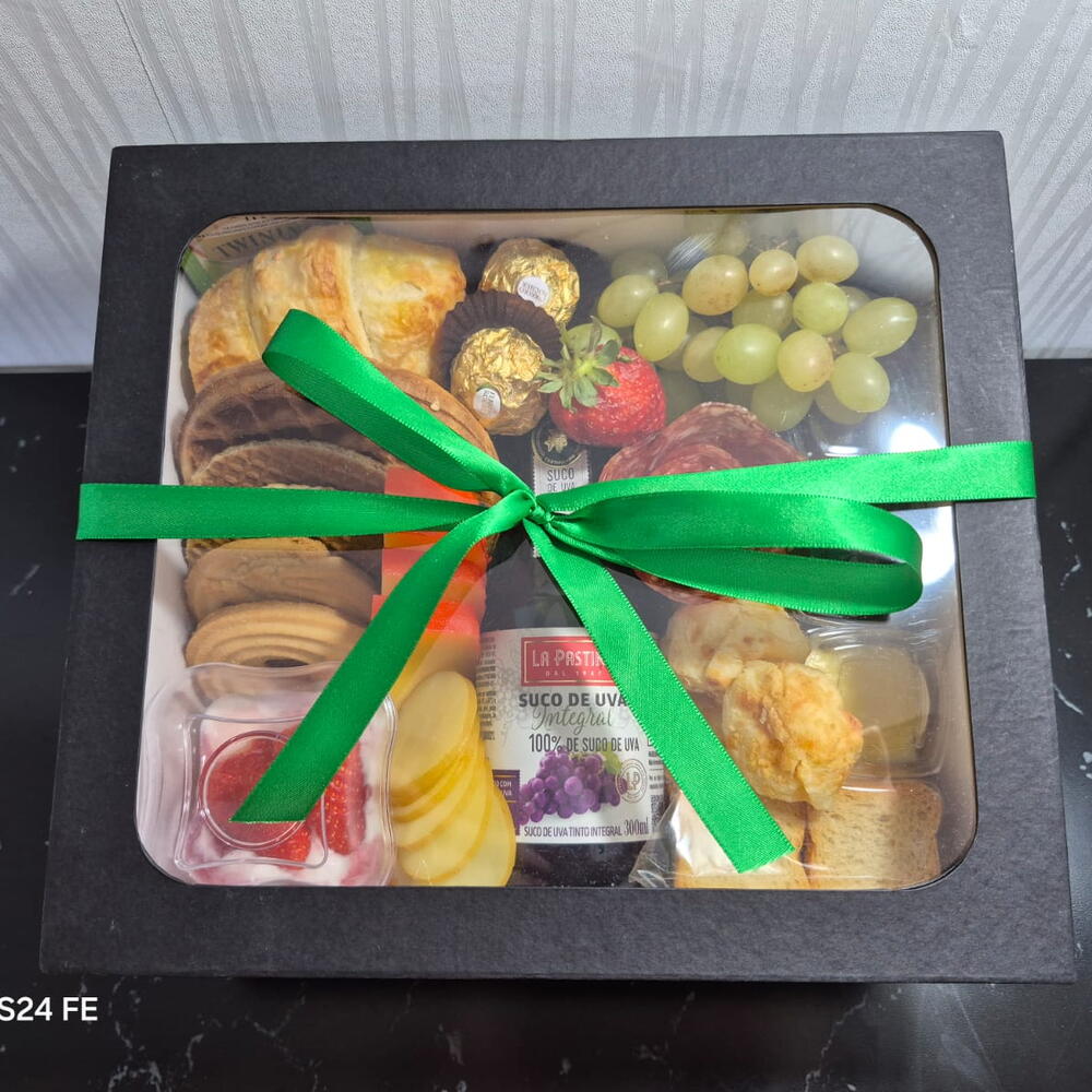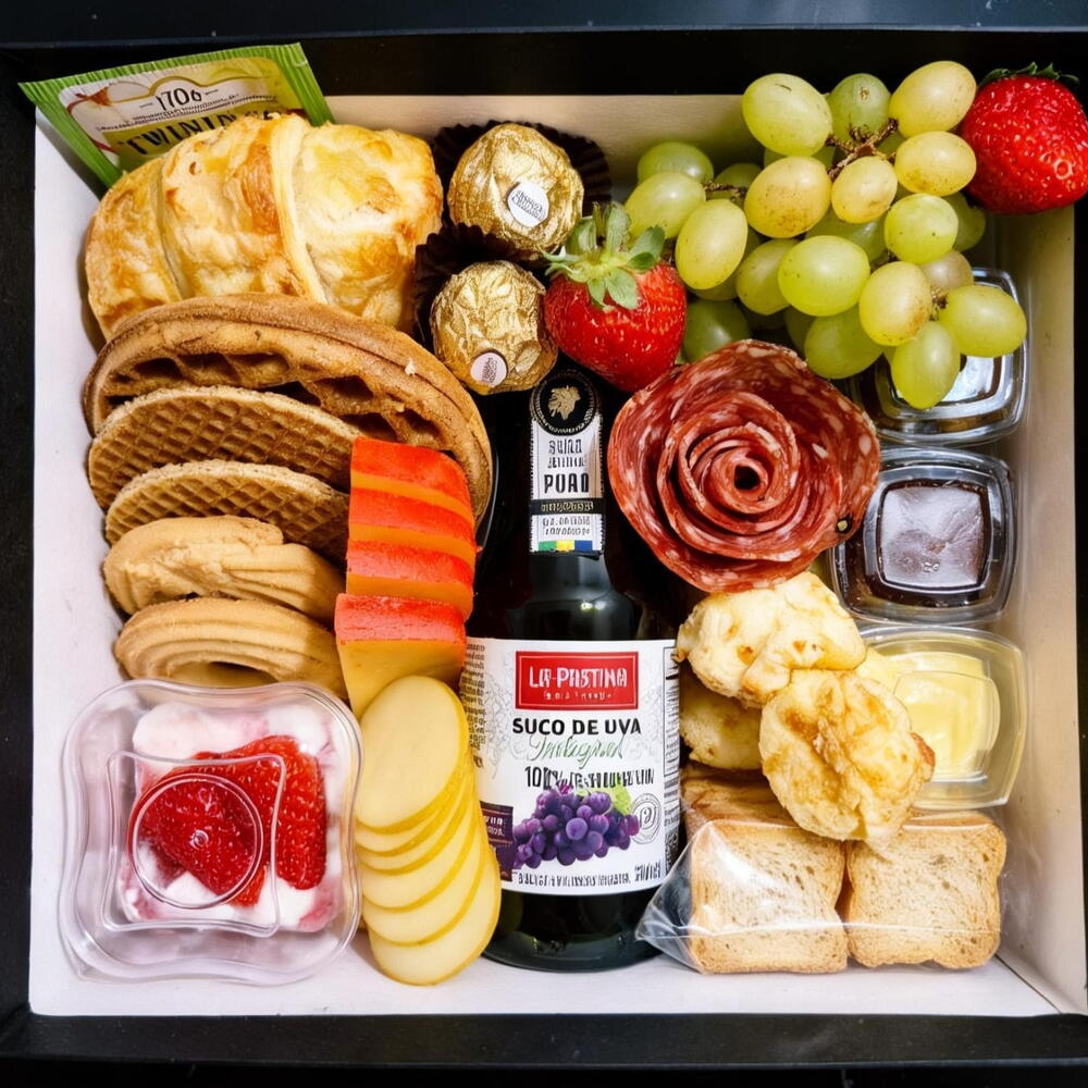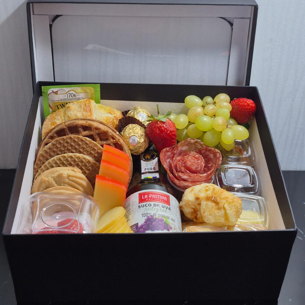 biscoitos amanteigados - 2 un. bombons - 2 un. caixa cartonada - 1 un. pães de queijo - 5 un. waffle - 1 un. torradinhas - 10 un. flor de salame - 1 un. geleia e manteiga - 1 un. chá importado twinings - 1 un. croissant folhado - 1 un. uvas e morangos frescos - 1 un. suco integral de uva em garrafa - 1 un. queijos fatiados - porções - 2 un. iogurte com fruta - 1 un.
