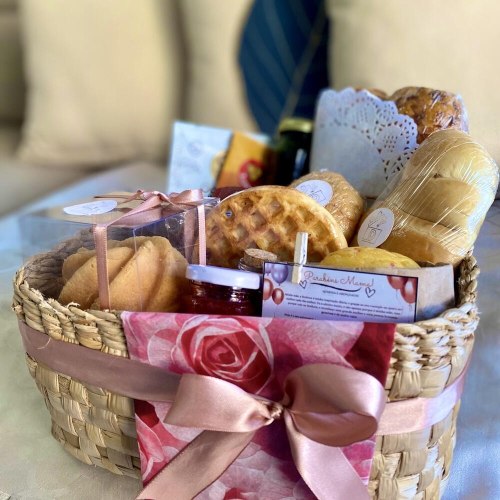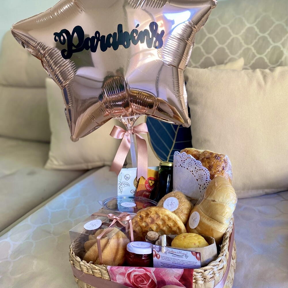 croissant - 1 un. uva - 1 un. pão doce - 2 un. mini bolo - 1 un. waffle - 1 un. morango - 6 un. drip coffee - 1 un. mini sonho - 1 un. mel (porção mini vidro) - 1 un. geleia de morango ( artesanal) - 1 un. pão de queijo mineiro - 4 un. suco de uva integral 200 ml - 1 un. cappuccino três corações sachê - 1 un. cartão personalizado com foto - 1 un. cesto de taboa artesanal - 1 un. balão foil personalizado - 1 un.