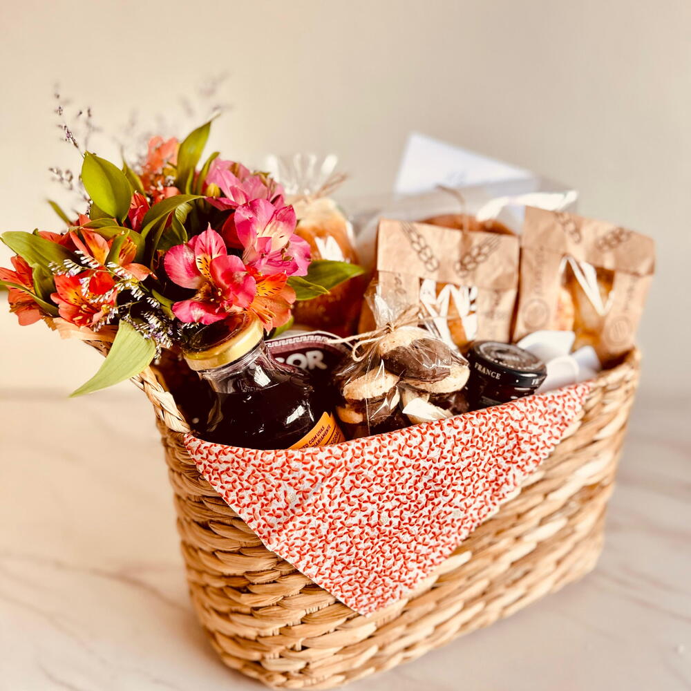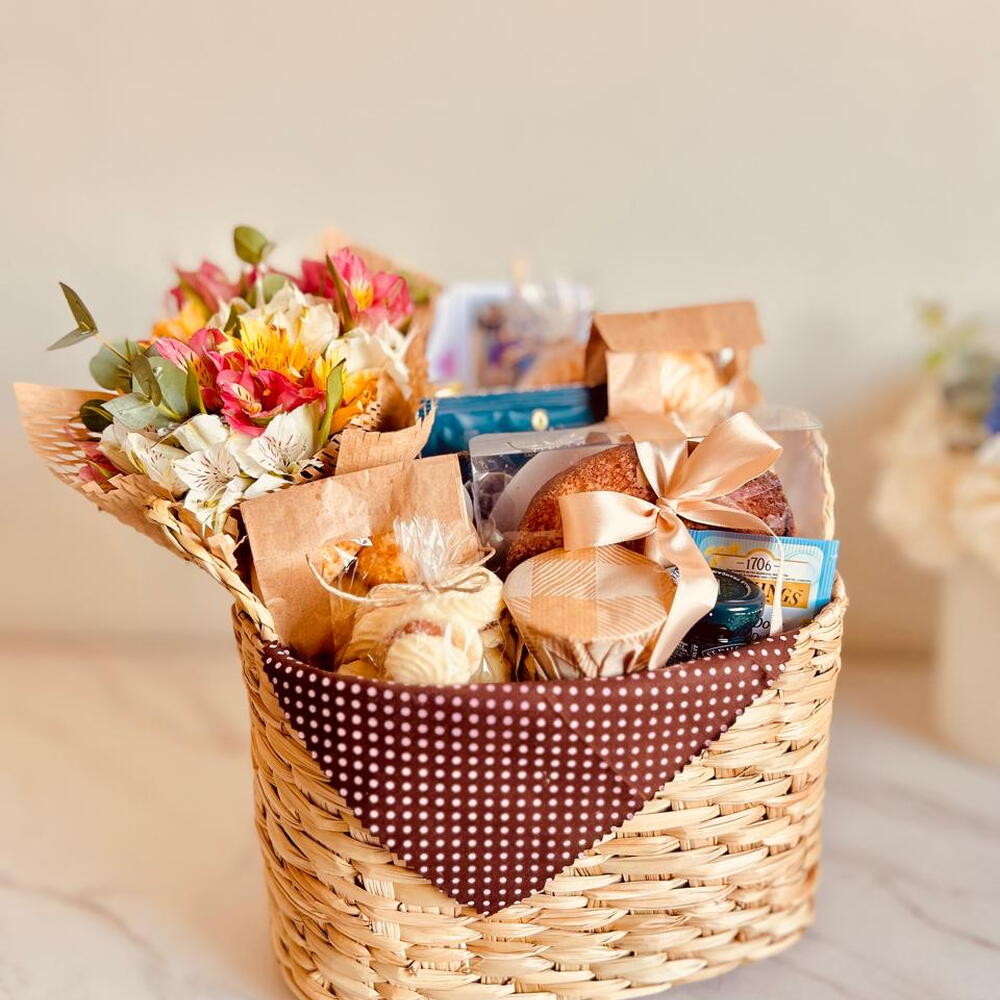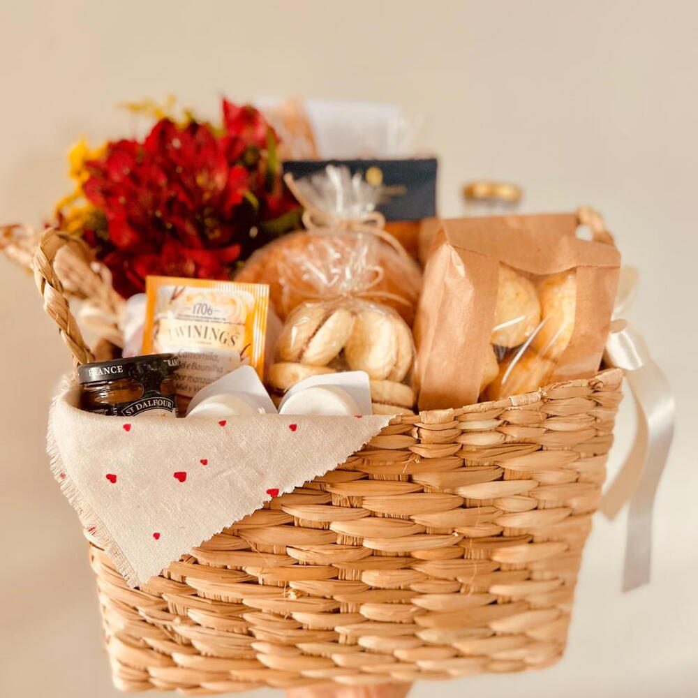 biscoitos amanteigados - 1 un. 1 mini geleia - 1 un. 1 sachê de chá - 1 gr. cartão - 1 un. flores naturais - 1 un. 1 croissant recheado - 1 un. cesta de palha de taboa m - 1 un. 03 mini pães brioche - 3 un. 2 mini cream cheese - 2 un. pão queijo 150g - 1 un. 1 iogurte - 1 un. 1 drip coffee - 1 un. 1 suco integral 500ml - 1 gr. 1 bolo 200g - 1 un.