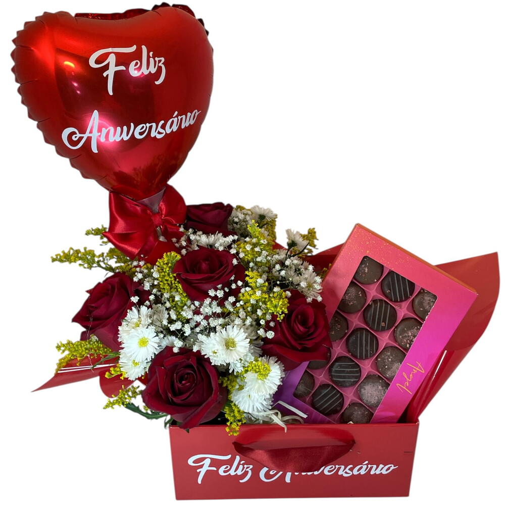 Cesta de aniversário com balão, para presentear em uma data muito especial, comemorar o aniversário com flores e chocolates para ser uma data inesquecível. Esta composição inclui: Arranjo de cinco rosas e demais flores de complemento Balão metalizado 22cm aprox Caixa Angel Caixa com tema Feliz aniversário