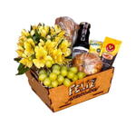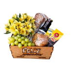 laço - 1 un. baguete parmesão - 1 un. arranjo de astroméria - 1 un. biscoito belvita - 1 un. sachê capuccino - 1 un. croissant manteiga - 1 un. suco natural de uva - 1 un. uvas sem sementes - 1 un. celofane embalagem - 1 un. cesta artesanal em mdf - 1 un.