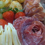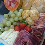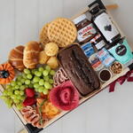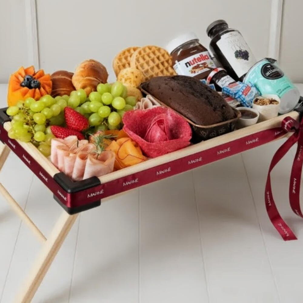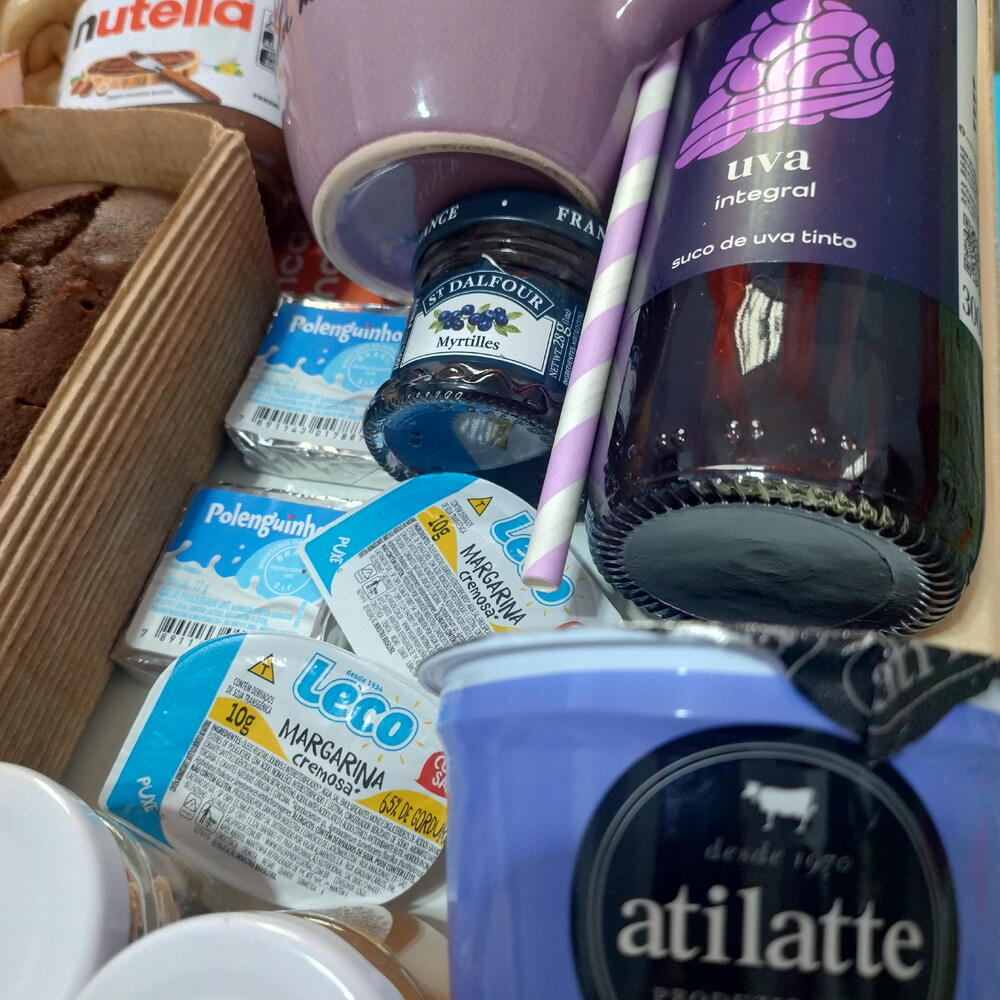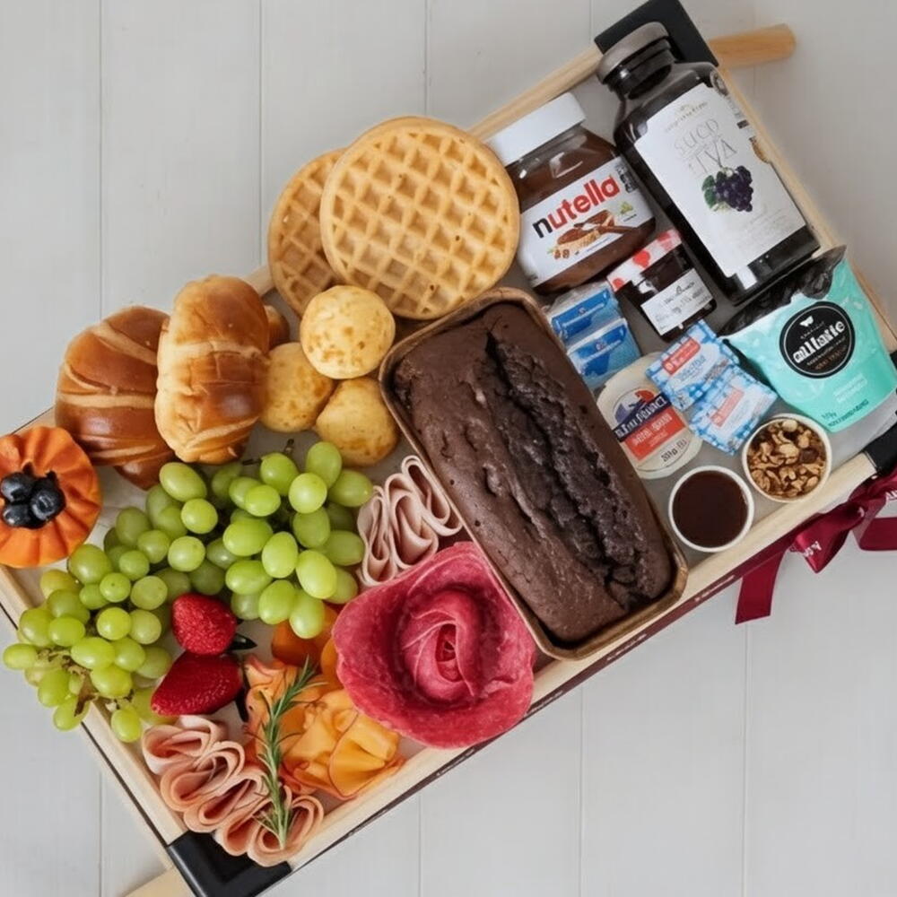 croissant - 2 un. waffle - 2 un. morangos - 4 un. mini manteiga - 2 un. blister de mel - 1 un. queijo polenghinho - 2 un. suco de uva integral 250ml - 1 un. granola 30g - 1 un. iogurte natural 170g - 1 un. pasta de avelã nutella 140g - 1 un. bolo sabores 180g - 1 un. mini geleia 30grs - 1 un. frios queijo mussarela fatias - 100 gr. frios peito de peru fatias - 100 gr. frios salame fatiado - 100 gr. cachos de uvas verdes - 2 un. meio mamão cortado - 1 un. bandeja de madeira com pé - 1 un. pães de queijo pequenos - 3 un.