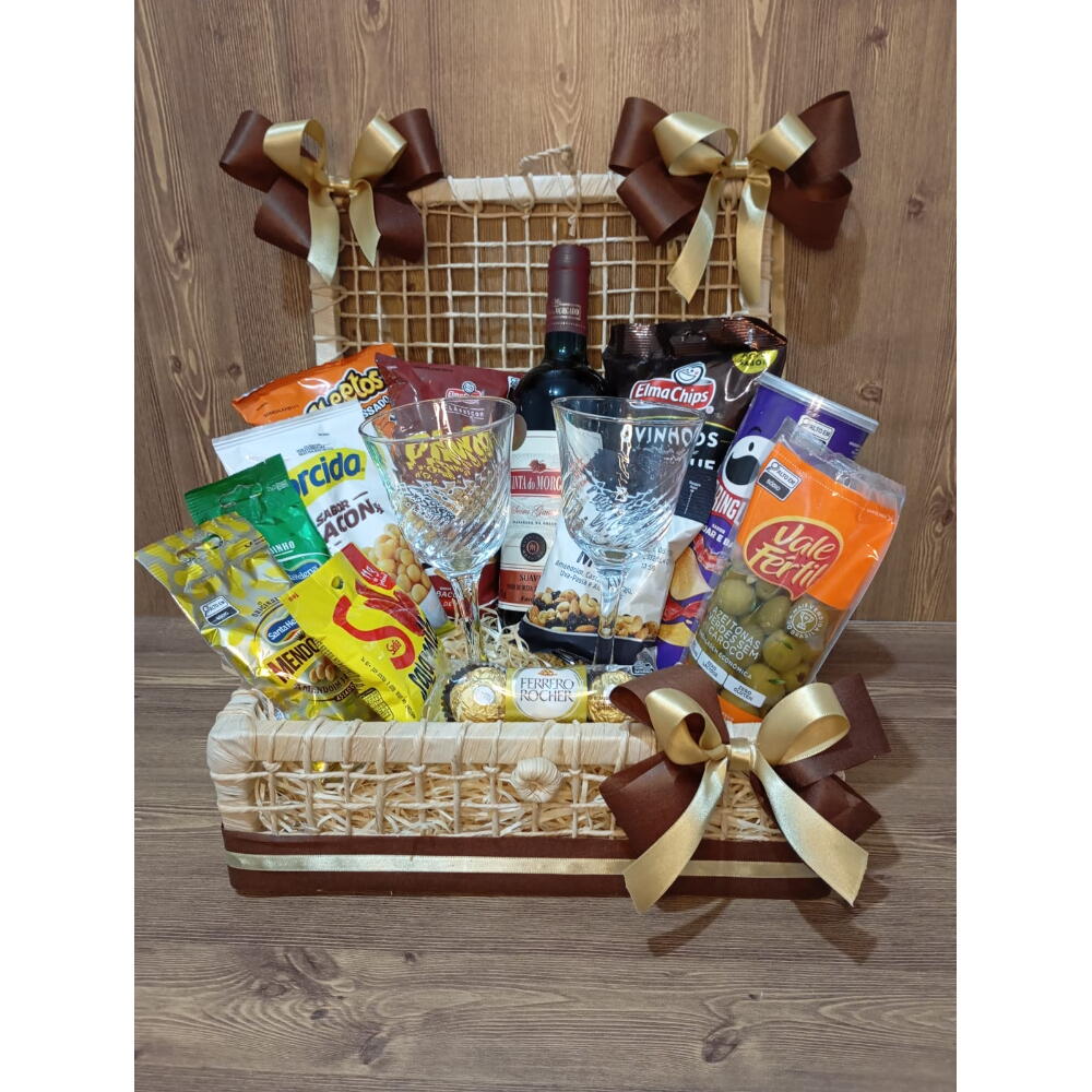 ferrero rocher - 1 un. torcida - 1 un. pringles - 1 un. azeitonas - 1 un. amendoins - 2 un. castanhas - 1 un. cheetos - 1 un. taças de vidro - 2 un. ovinhos - 1 un. salaminhos - 1 un. pingo de ouro - 1 un. vinho quinta do morgado - 1 un. cesta bau personalizada - 1 un.