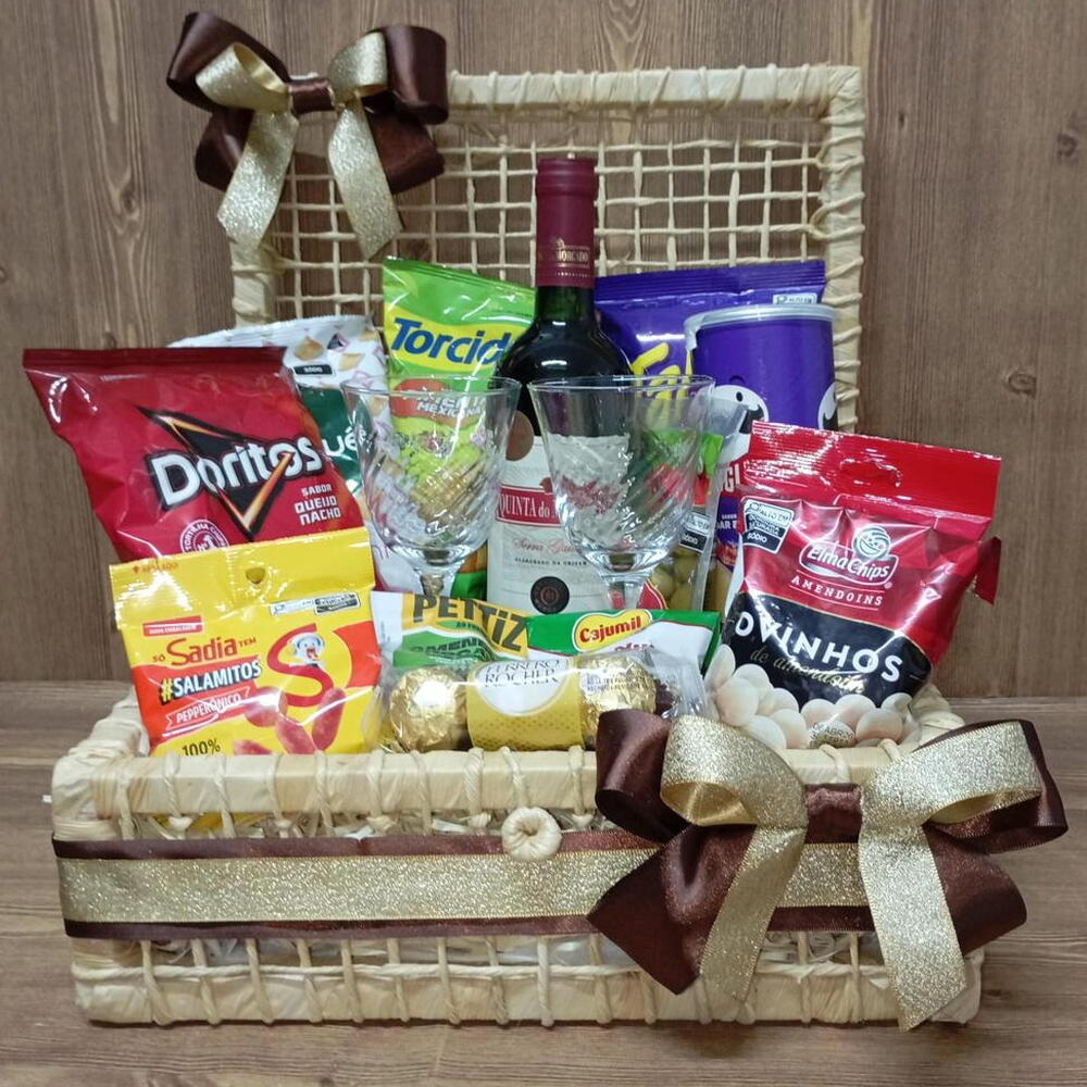 Este fabuloso presente, ideal para os apreciadores de boas bebidas, é um tesouro de delícias culinárias acolhedoramente embaladas. No coração deste conjunto, um vinho eminentemente elegante - Quinta do Morgado - 750 ml, para que possas desfrutar de um trago suave e acolhedor. Além disso, acompanha duas belas taças de vidro para a experiência completa de degustação. Acompanhados por uma variedade de irresistíveis petiscos salgados: Doritos, Salamitos, Piraquê, salgadinho Torcida, azeitonas e Takis, trazendo um perfeito equilíbrio de texturas e sabores. Para um toque mais leve, não esquecemos as batatas Pringles. Os amantes de amendoins vão adorar a nossa seleção sem casca, crocante e em formato ovinho. E para dar um toque de requinte, adicionamos um mix de castanhas e requintados chocolates Ferreiro Rocher. Este presente de bebidas é a combinação perfeita para um jantar elegante ou uma noite aconchegante!