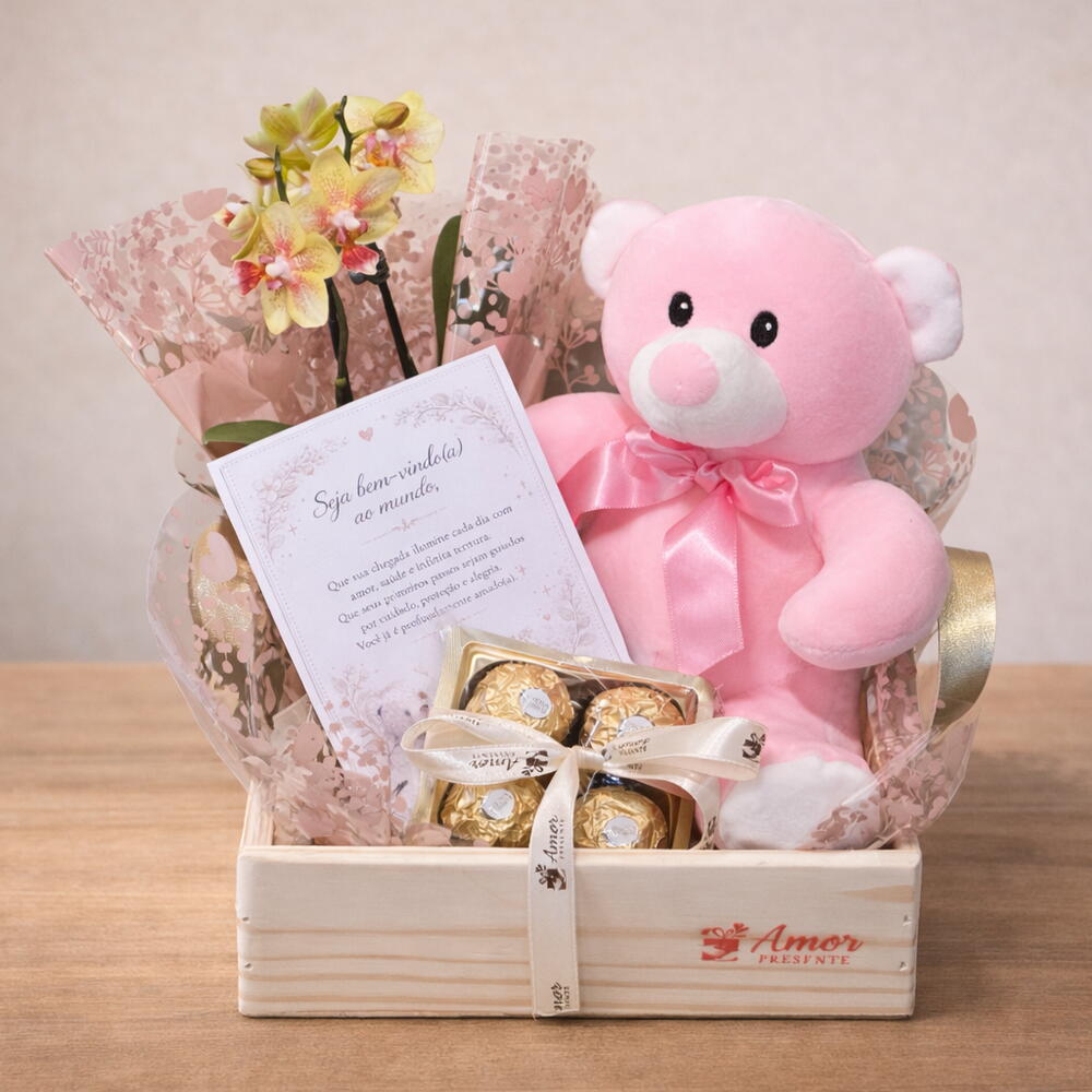 Um presente que traduz carinho, ternura e celebração. A Cesta Bem-Vindo(a) ao Mundo reúne ursinho de pelúcia macio, mini orquídea delicada, chocolates especiais e cartão personalizado, criando uma experiência sofisticada e afetiva para celebrar a chegada do bebê. Com design elegante e cores suaves, é perfeita para quem busca um presente de maternidade refinado, neutro e memorável. 👶 Ideal para recém-nascido 🌸 Presente delicado e elegante 🎁 Cesta maternidade com pelúcia e flores 🚚 Enviamos direto para hospital ou residência Porque a chegada de uma nova vida merece um presente à altura desse momento.