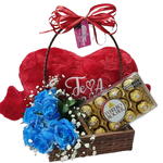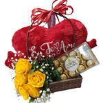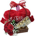 Kit com uma linda Cesta de 23x23x07cm, recheada com um adorável pelúcia em forma de coração de 50x32cm, 12 unidades do irresistível chocolate Ferrero Rocher, e um arranjo de 6 rosas frescas que trazem um charme especial. É o presente ideal para demonstrar carinho e afeto em qualquer ocasião! Obs: Todos os itens poderão sofrer alterações, dependendo da disponibilidade local. Sempre mantendo a qualidade.