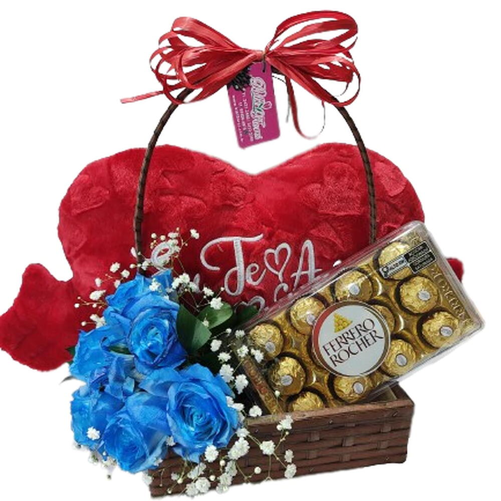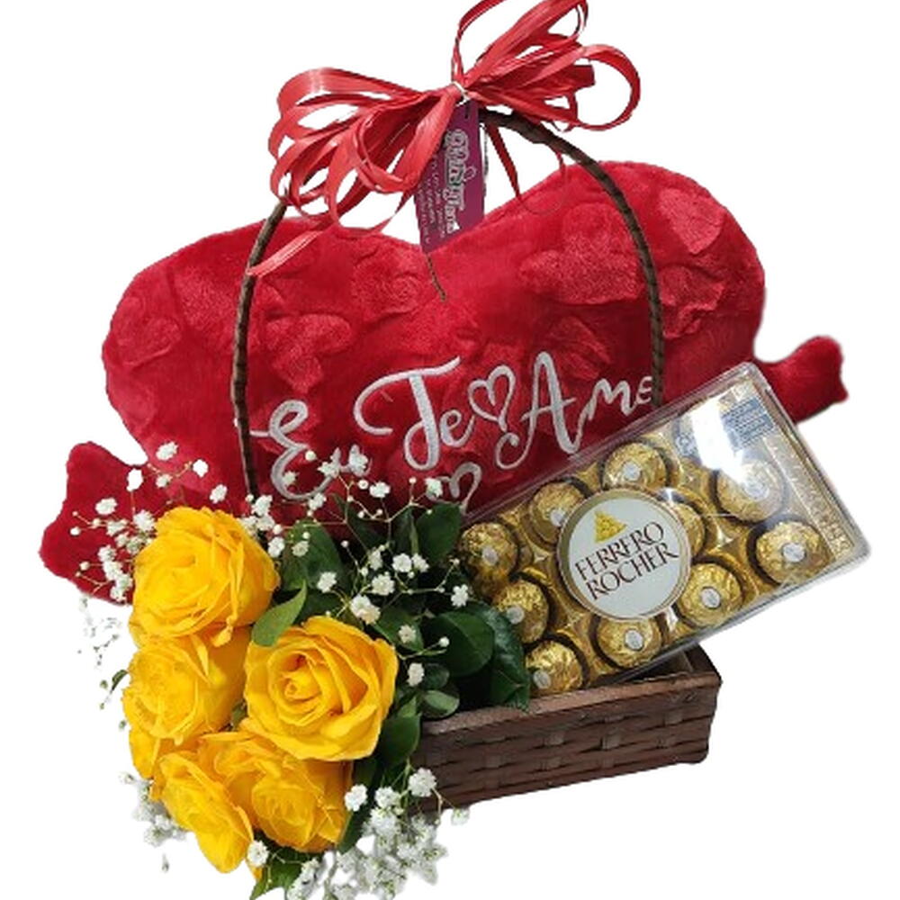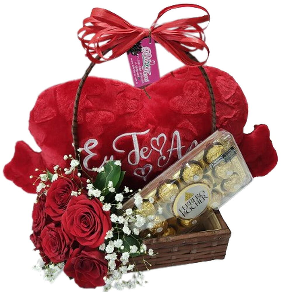 Kit com uma linda Cesta de 23x23x07cm, recheada com um adorável pelúcia em forma de coração de 50x32cm, 12 unidades do irresistível chocolate Ferrero Rocher, e um arranjo de 6 rosas frescas que trazem um charme especial. É o presente ideal para demonstrar carinho e afeto em qualquer ocasião! Obs: Todos os itens poderão sofrer alterações, dependendo da disponibilidade local. Sempre mantendo a qualidade.
