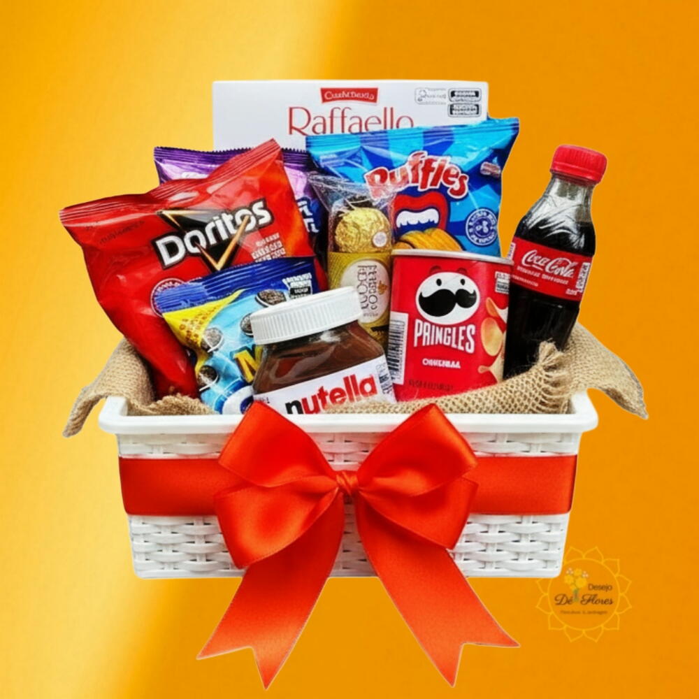 doritos - 1 un. bolinho ana maria - 1 un. mini oreo - 1 un. coquinha - 1 un. batata ruffles - 1 un. ferrero rocher com 03 und - 1 un. nutella deliciosa - 1 un. rafaello bombons - 1 un. pringles batata pequena - 1 un. cesto em material plástico decorado com laço - 1 un. embalagens saco celofane transparente e laço - 1 un.